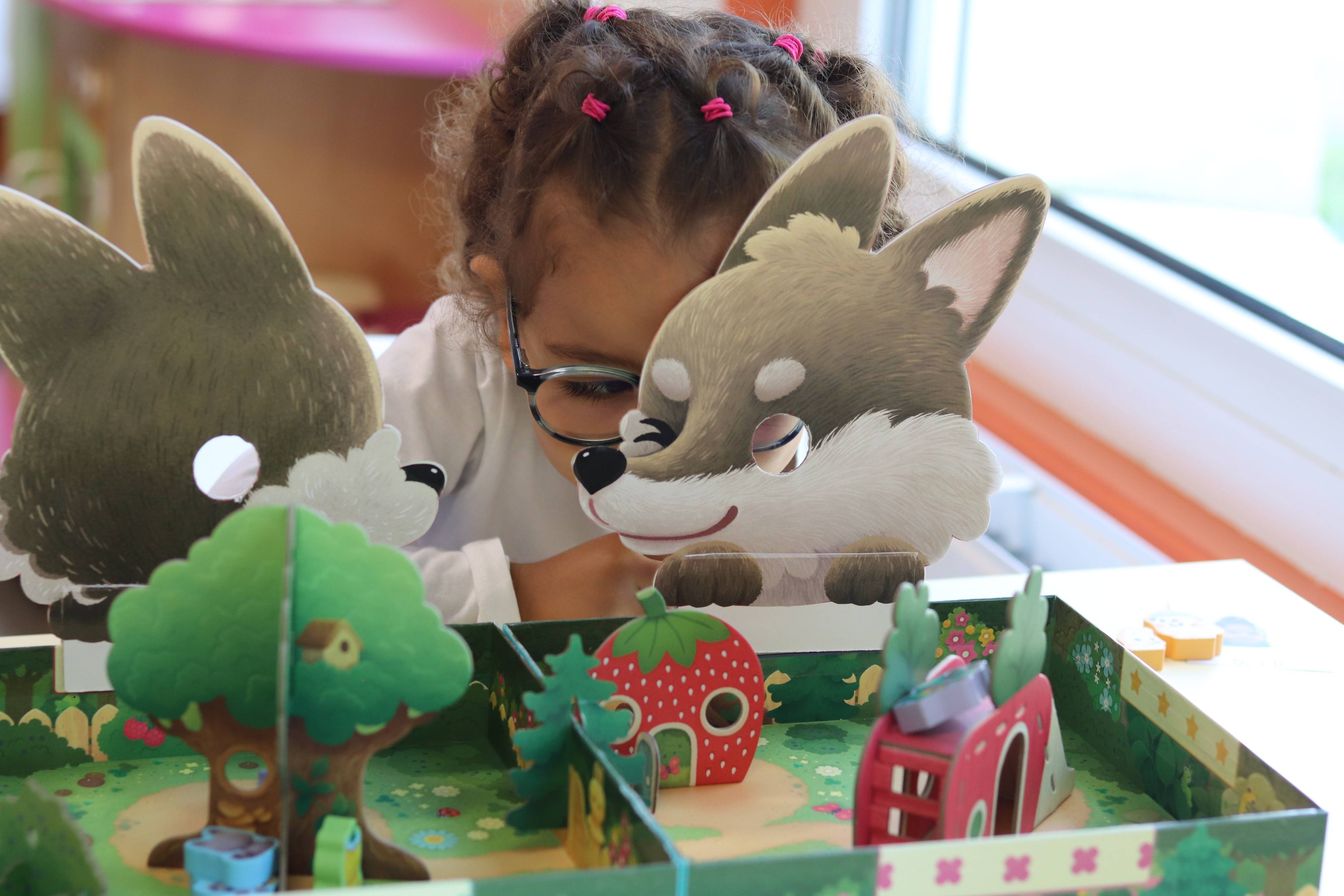 『かくれんぼフレンズ』は、ゲームの箱の中を小さな公園に見立てて、自分の担当する動物コマを、かくれんぼのオニ役が箱に取り付けたオオカミのおめん越しに覗く視界に入らないように、滑り台や木の影に隠して見つからないようにするゲームです。