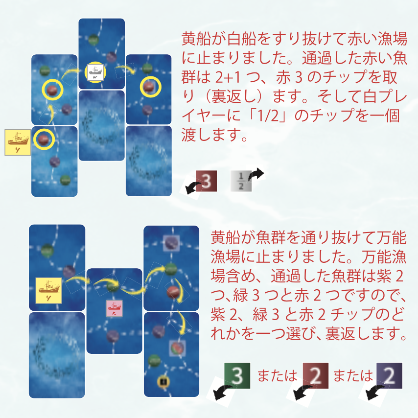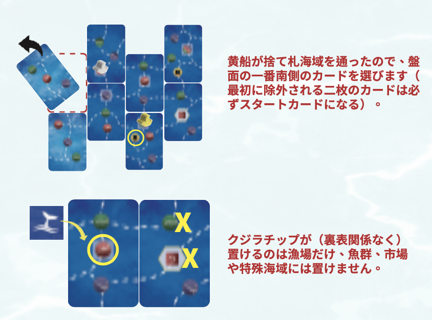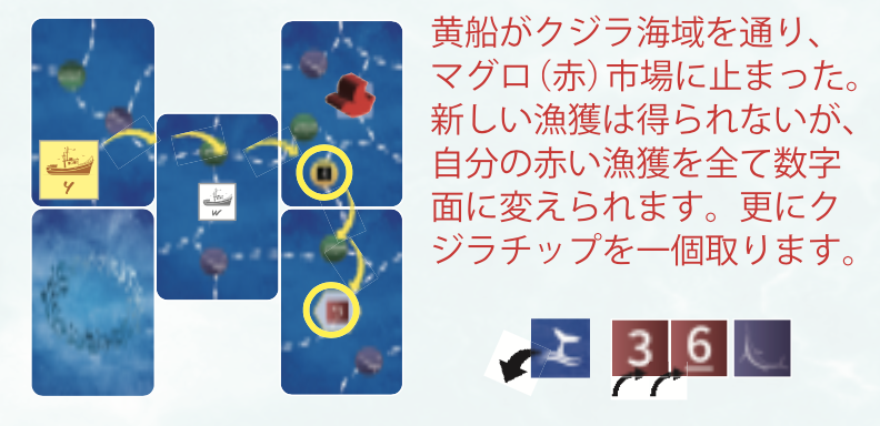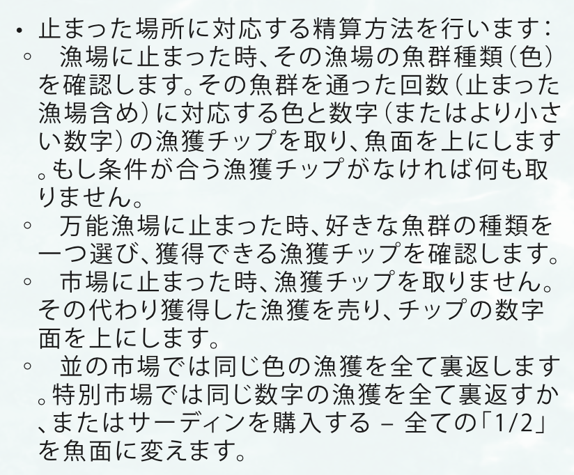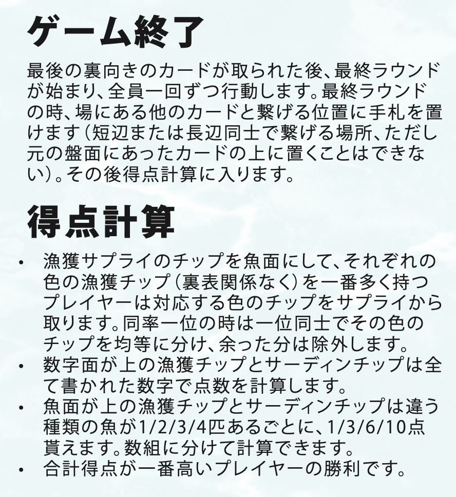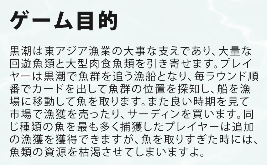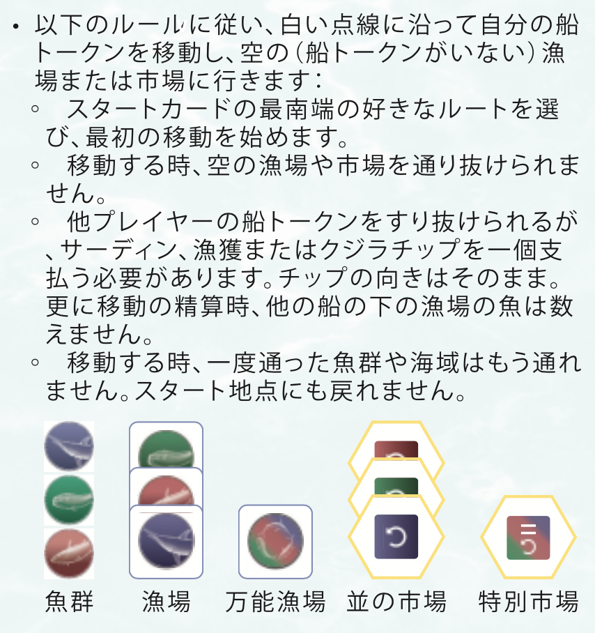 - カードで魚群のルートを広げ、漁場に入り、カジキやマグロを獲って航路を描いて得点しよう。