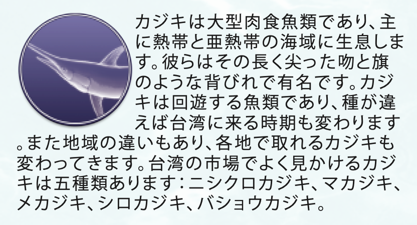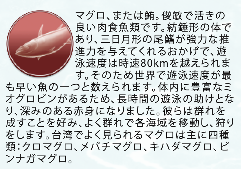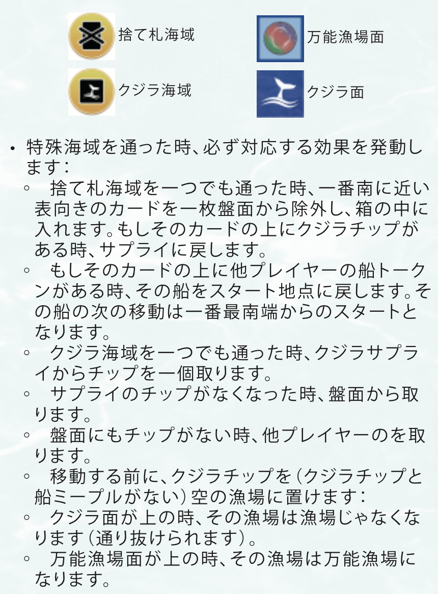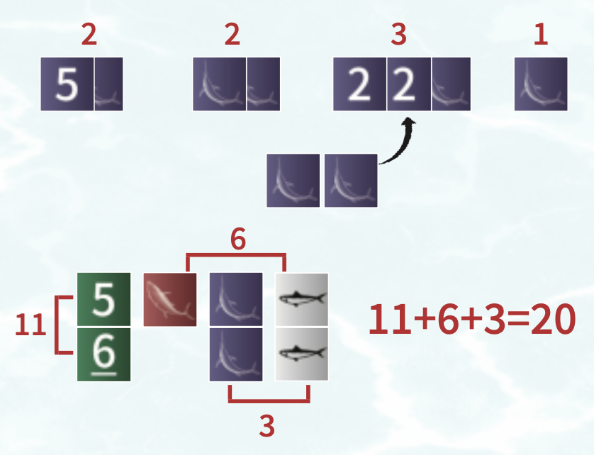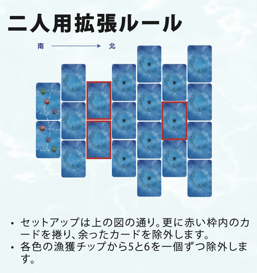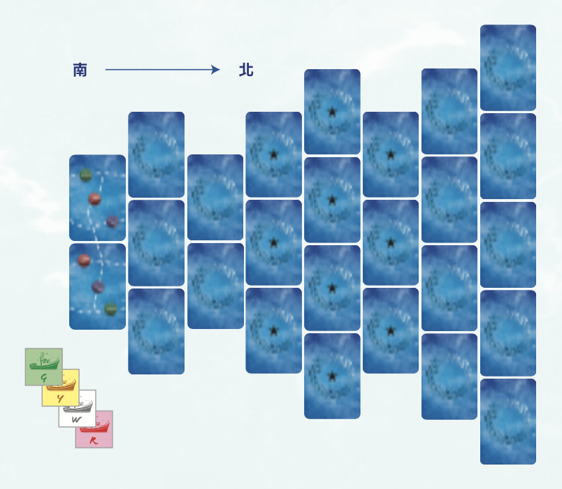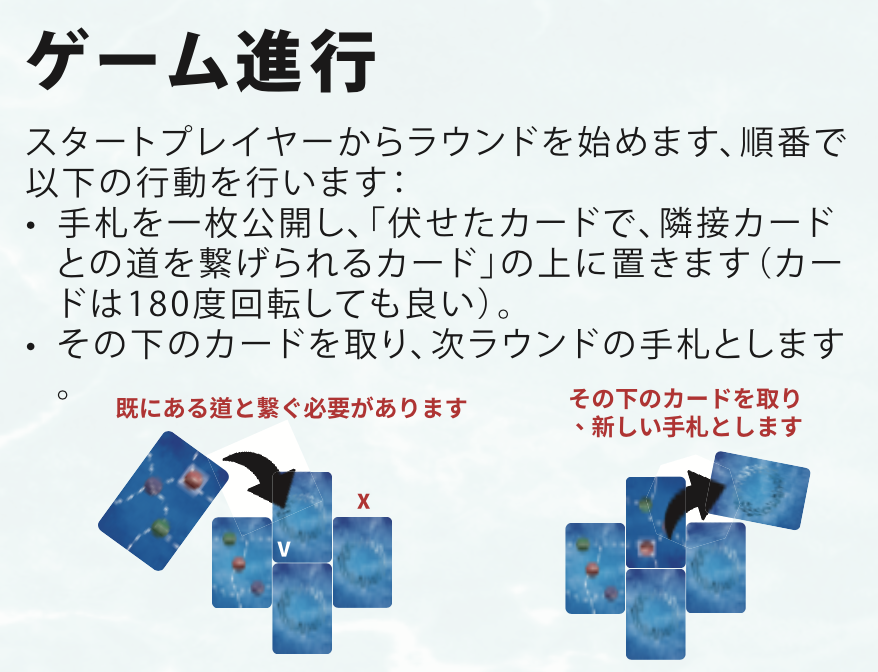 - カードで魚群のルートを広げ、漁場に入り、カジキやマグロを獲って航路を描いて得点しよう。