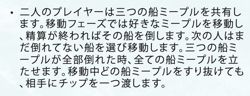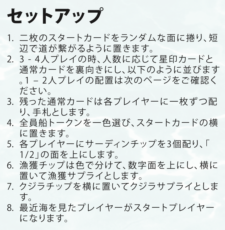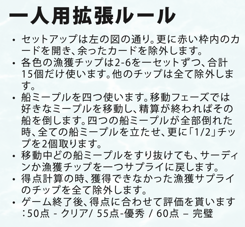- プレイ時間20〜30分、1〜4人対応。気軽に遊べる戦略ゲームで、毎ターン小さな海の冒険が楽しめます。