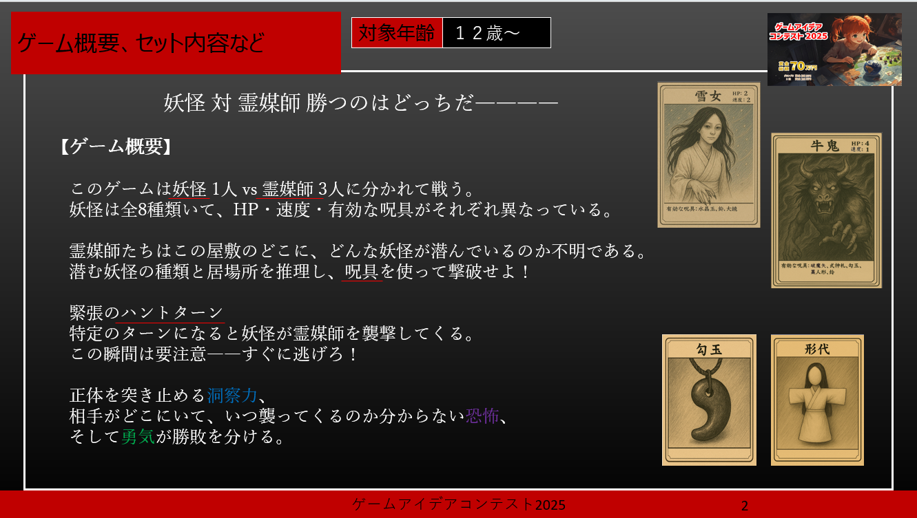 • このゲームは 妖怪1人 vs 霊媒師3人に分かれて戦う。 妖怪は全8種類いて、 HP・速度・有効な呪具がそれぞれ異なっている
