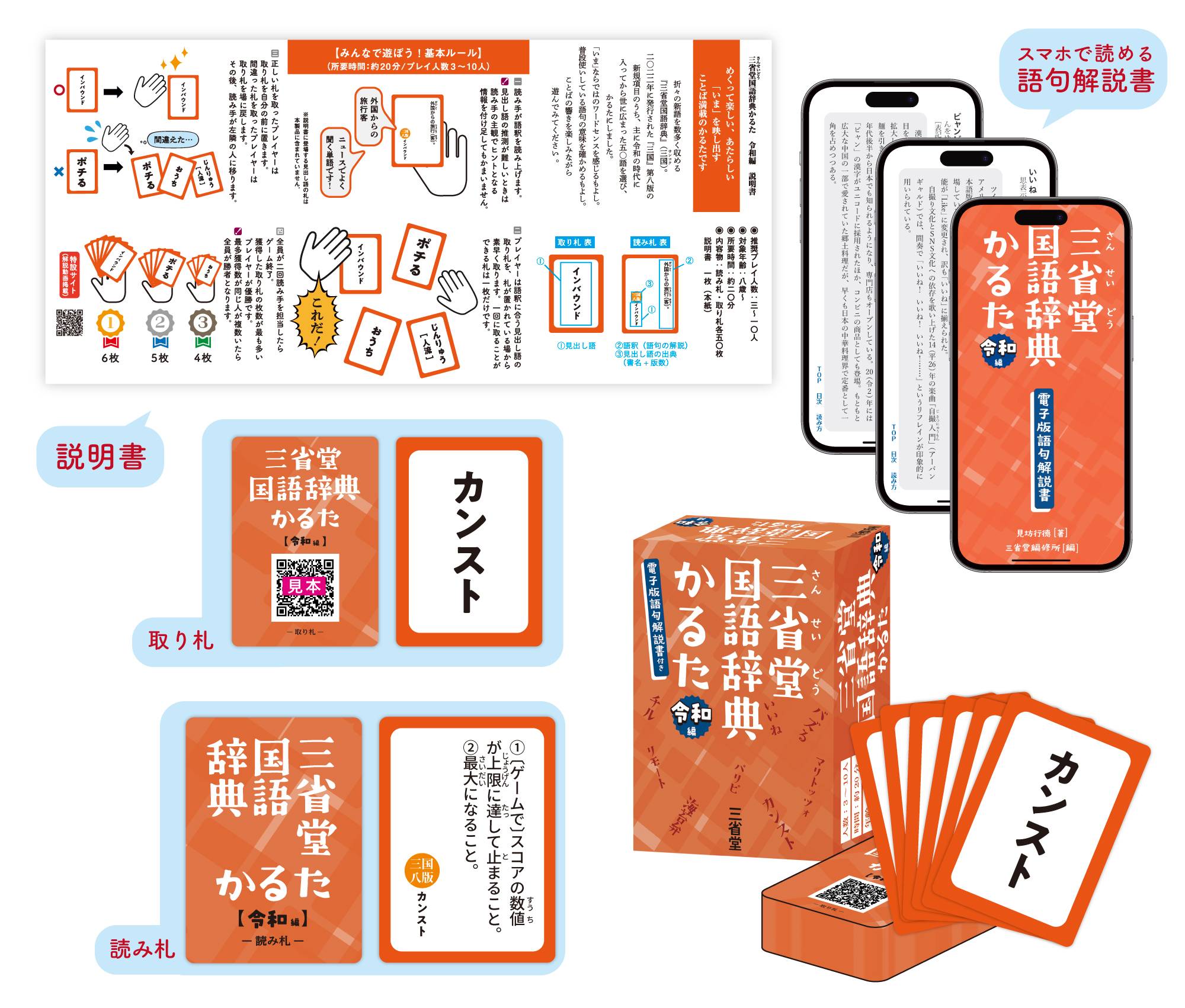 - 札に載ったことばの使われ方がよくわかる、電子版語句解説書付き(取り札裏の二次元コードからアクセス)。