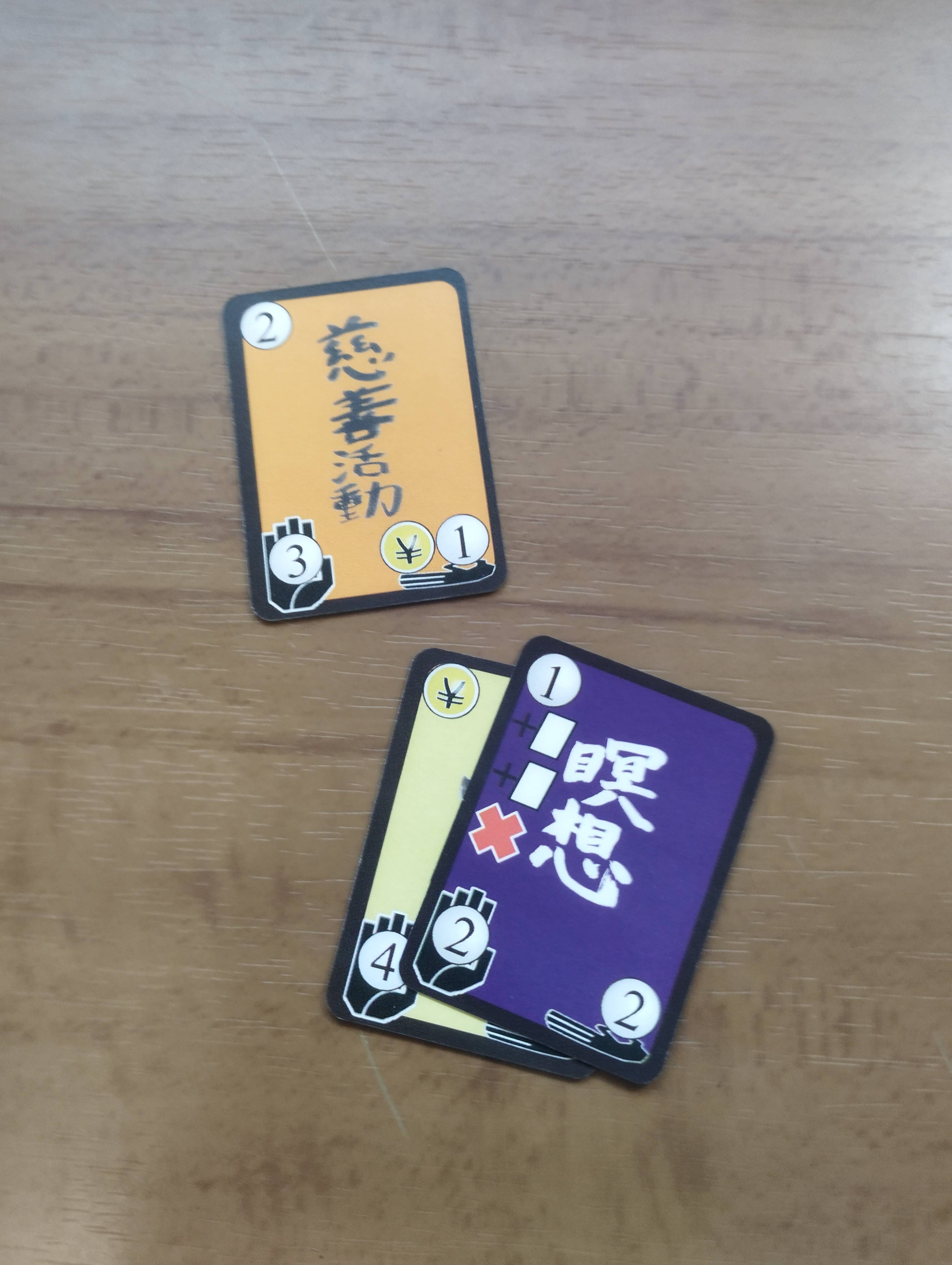 たとえば、「慈善活動」を獲得するには(¥)1点といずれかの1点のBPが必要です。(獲得したカードは自分の墓地におかれます)