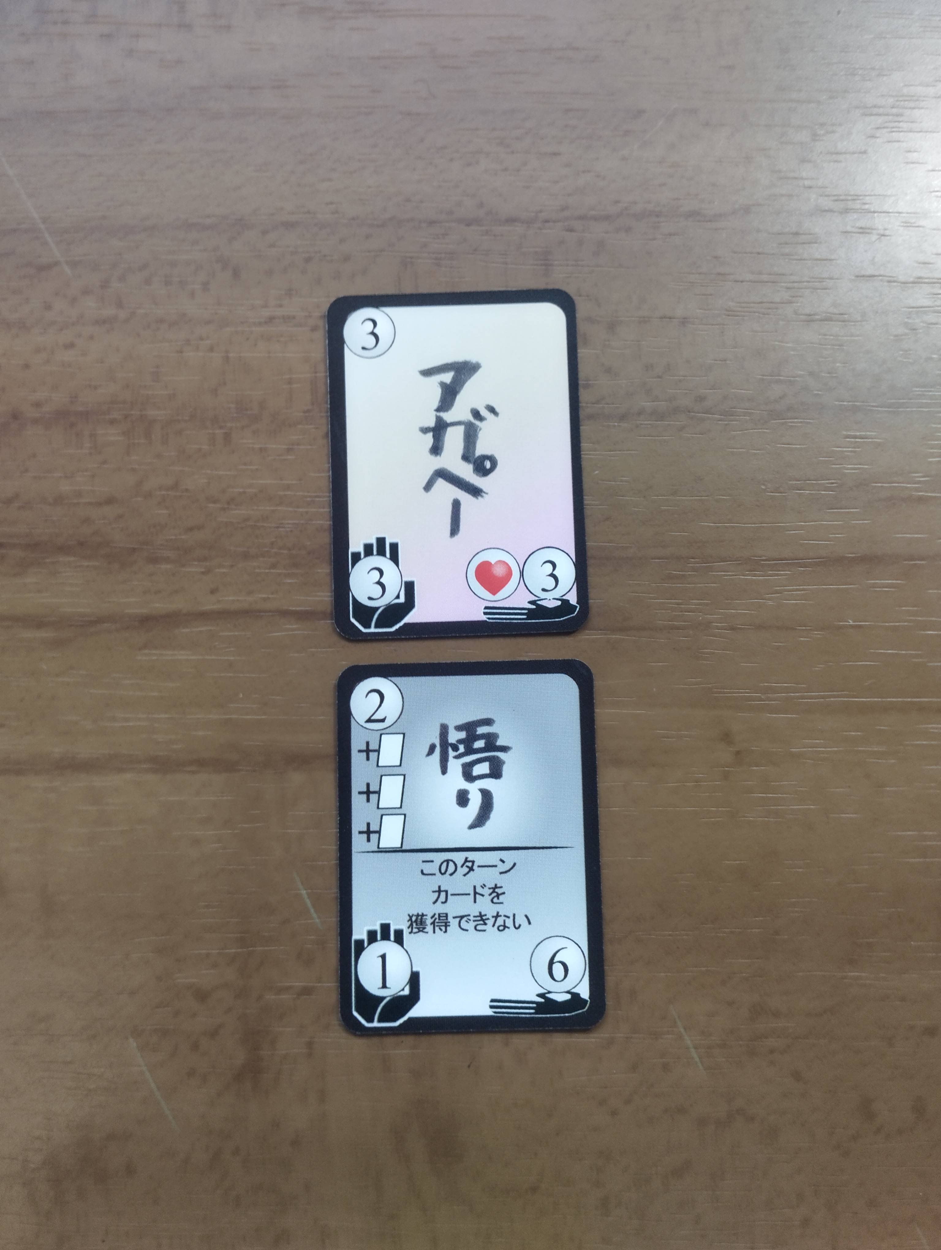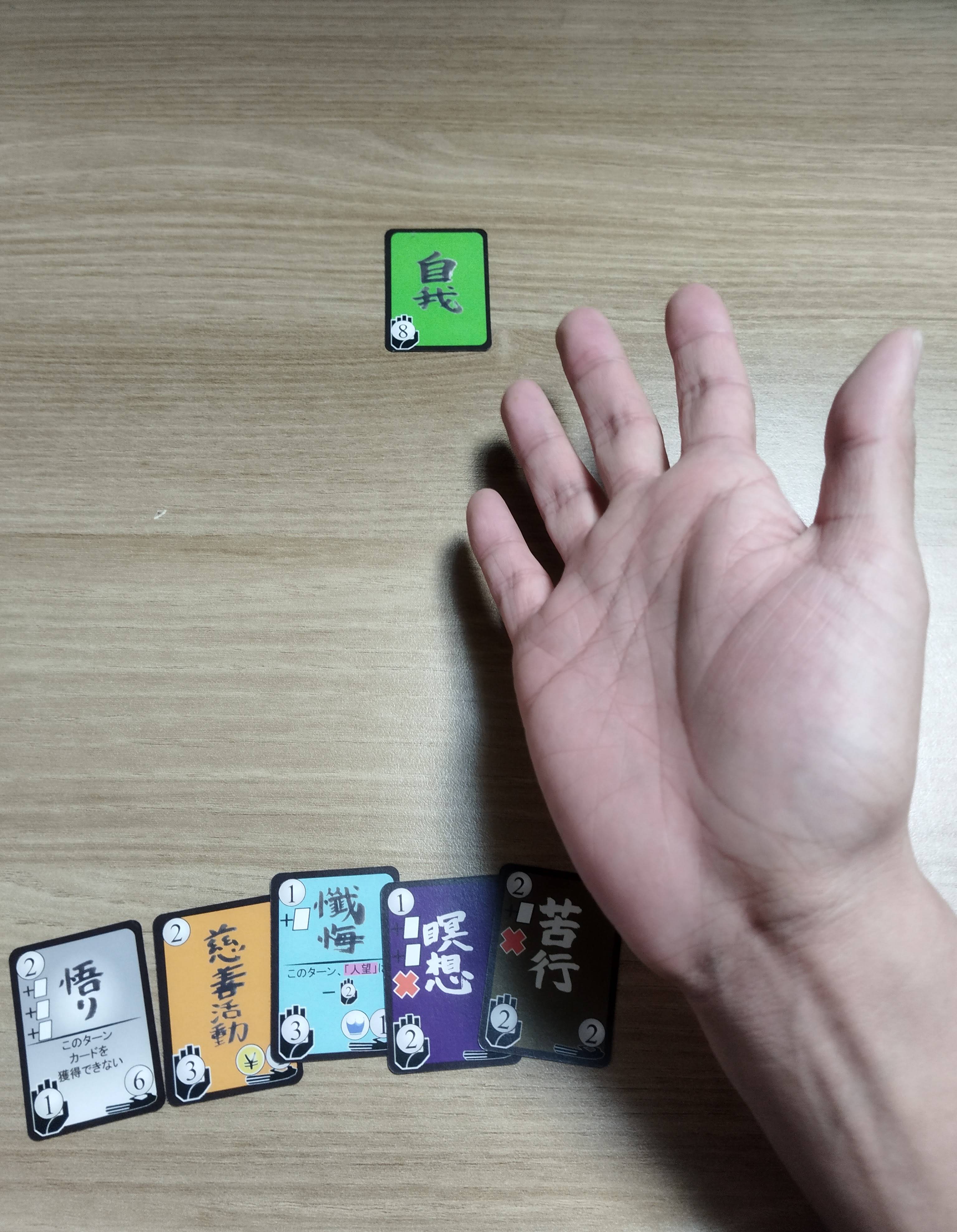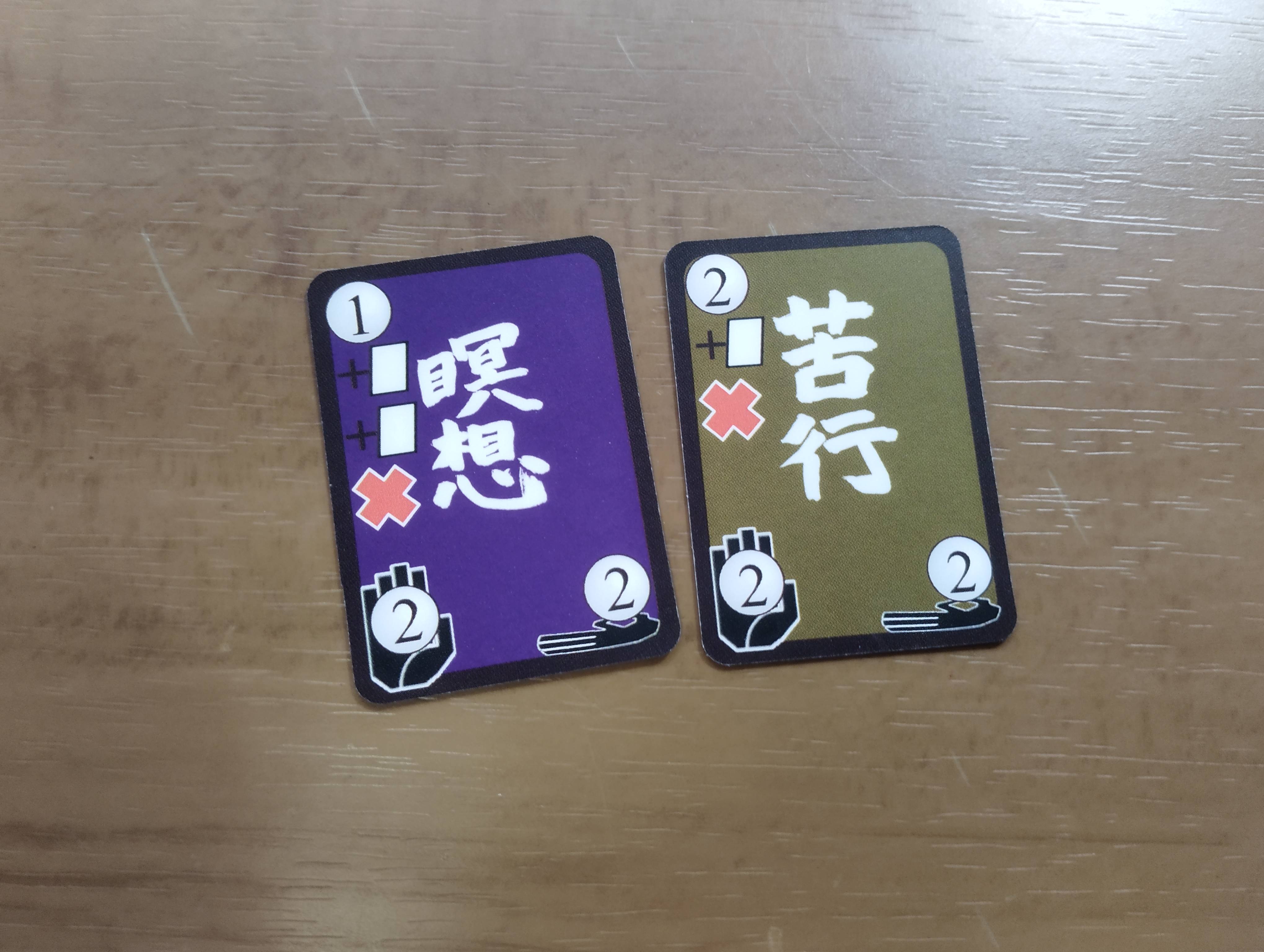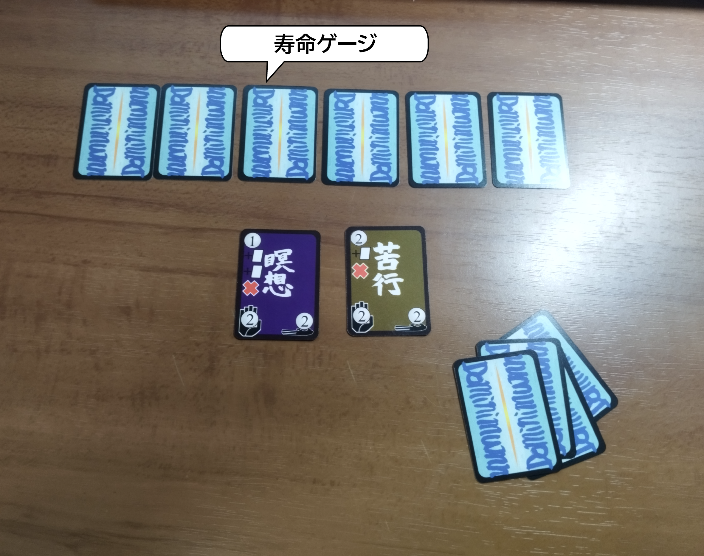 最初は「瞑想」と「苦行」だけを場札に置き、残りの6枚はウラ向きに並べて「寿命ゲージ」とします。