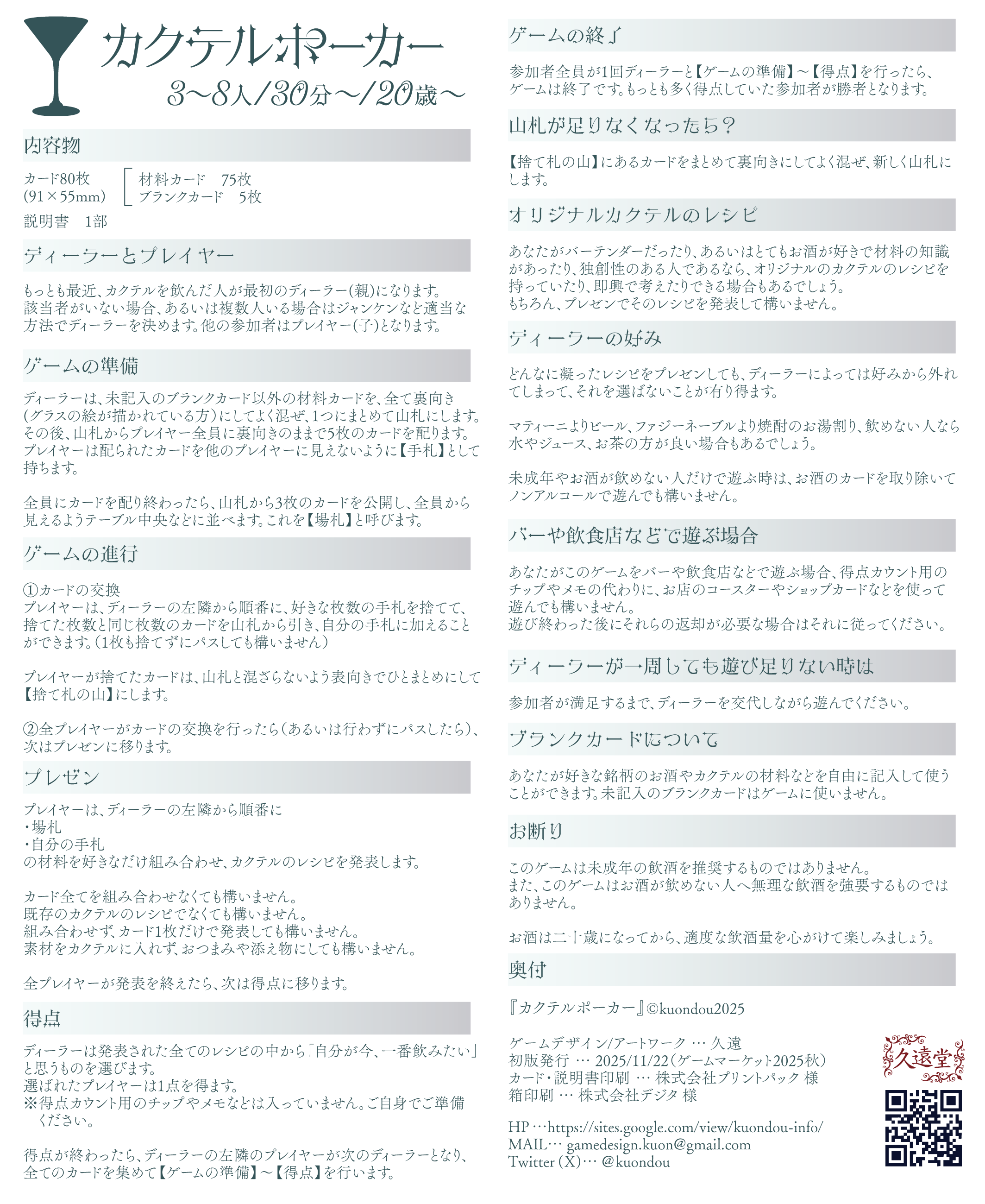参加者はディーラー(親)とプレイヤー(子)に分かれ、子は親の好きそうなカクテルを作ってプレセンする大喜利ゲーム。既存のカクテルレシピでも、オリジナルのレシピでも、親に「飲みたい」と思わせるのが肝心