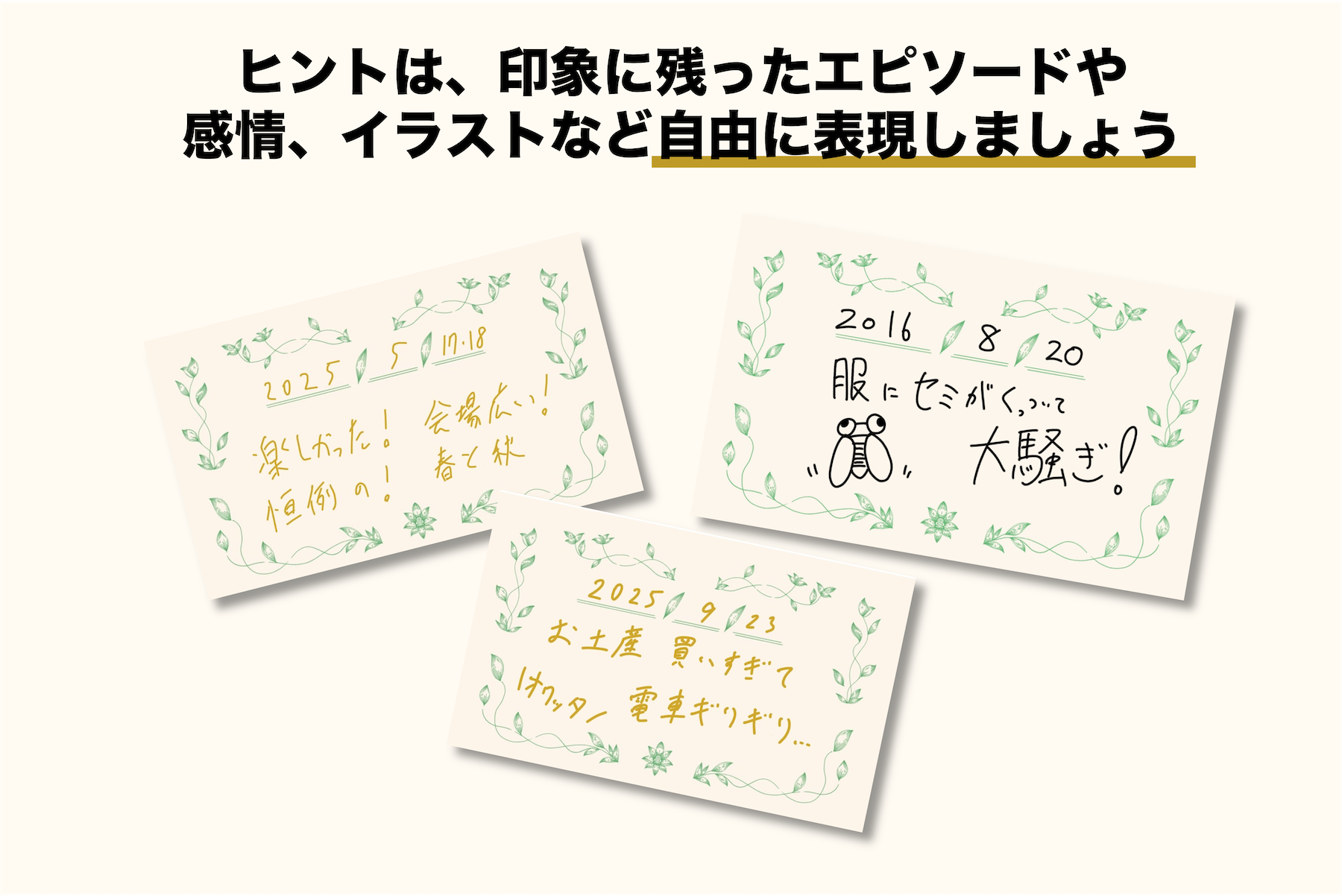 ヒントは、印象に残ったエピソードや感情、イラストなど自由に表現しましょう!
