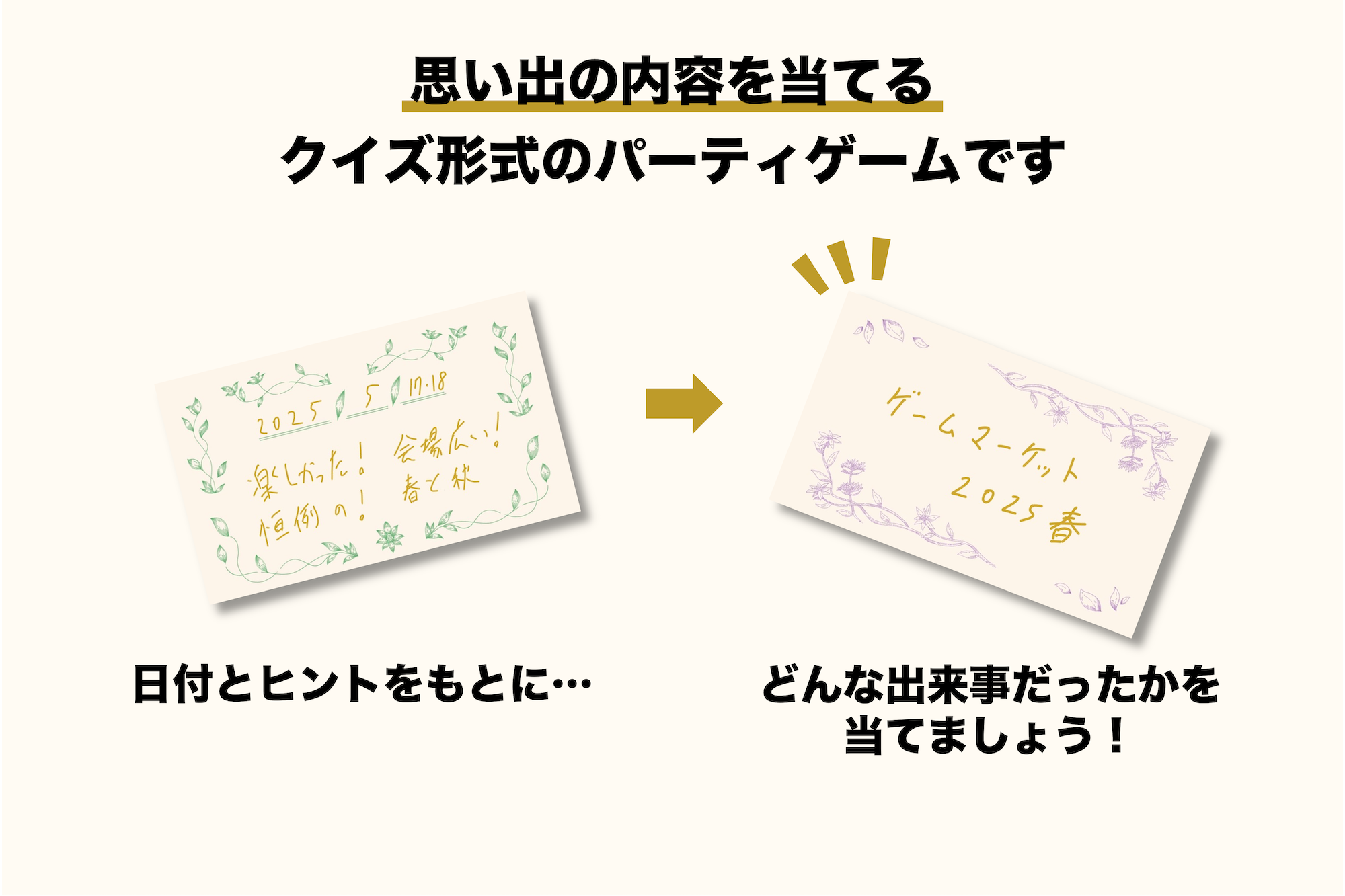- カードに書かれたヒントをもとに、どんな思い出だったかを当てる。やさしいクイズ形式のゲームです。