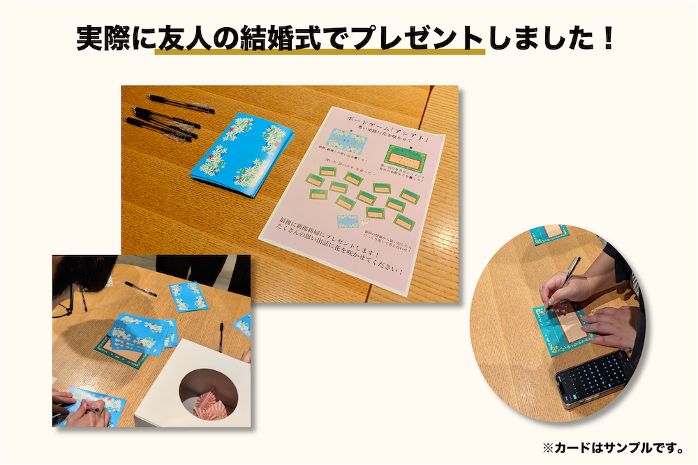 - アシアトは、プレゼントのためのボードゲーム。相手との思い出をカードに書き込みます。