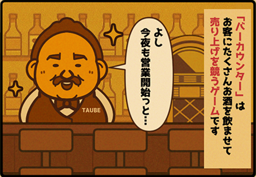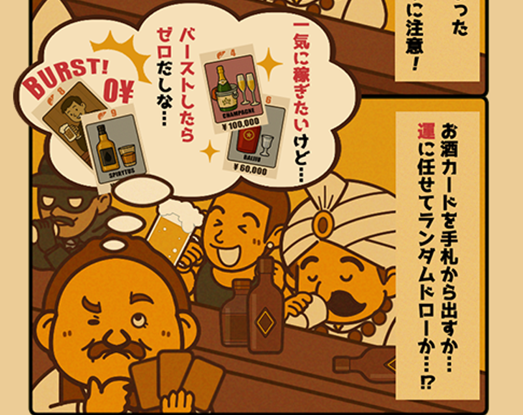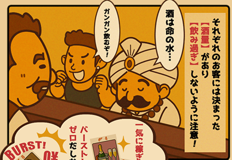 - プレイヤーたちはそれぞれ小さなバーの経営者となって やってくるお客さんが酔い潰れないように ギリギリを狙ってお酒を勧めていく。