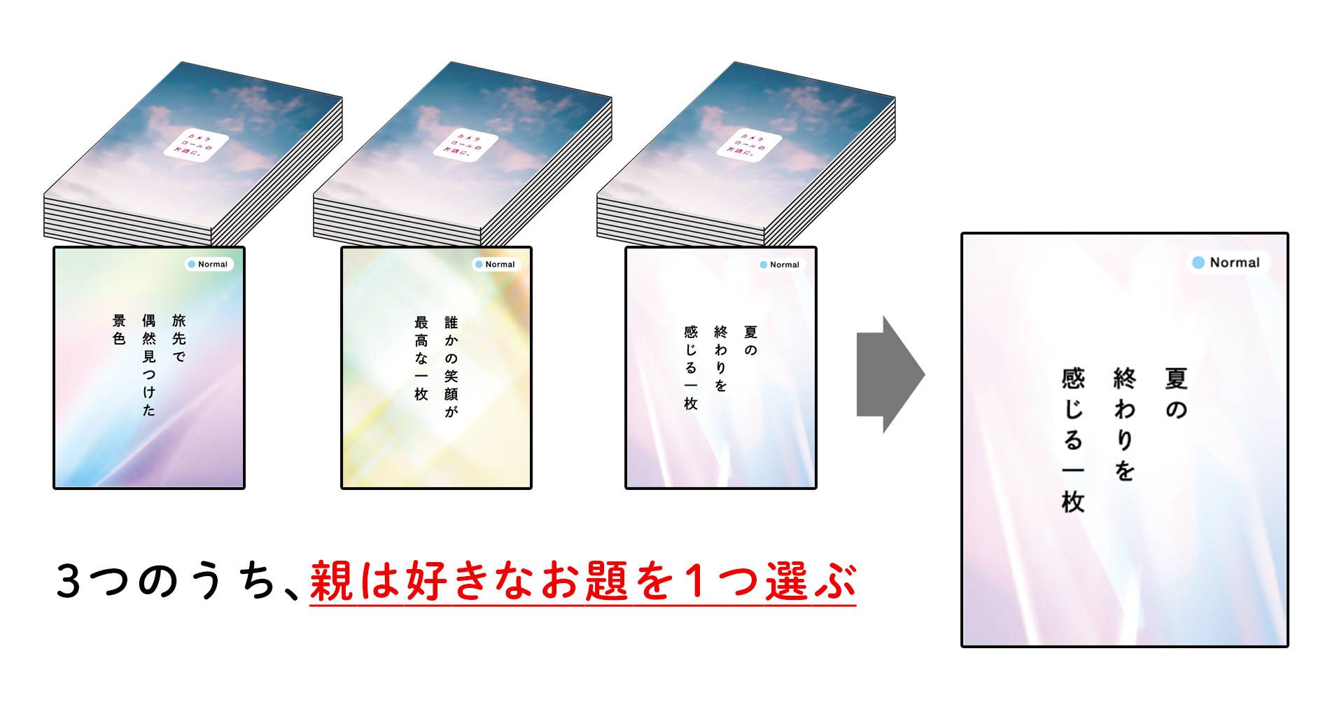 親は3つの山札から1枚ずつカードを引き、3枚のお題を並べます。その中から、場の雰囲気や難易度に合わせて好きなお題を1つ選び、読み上げます