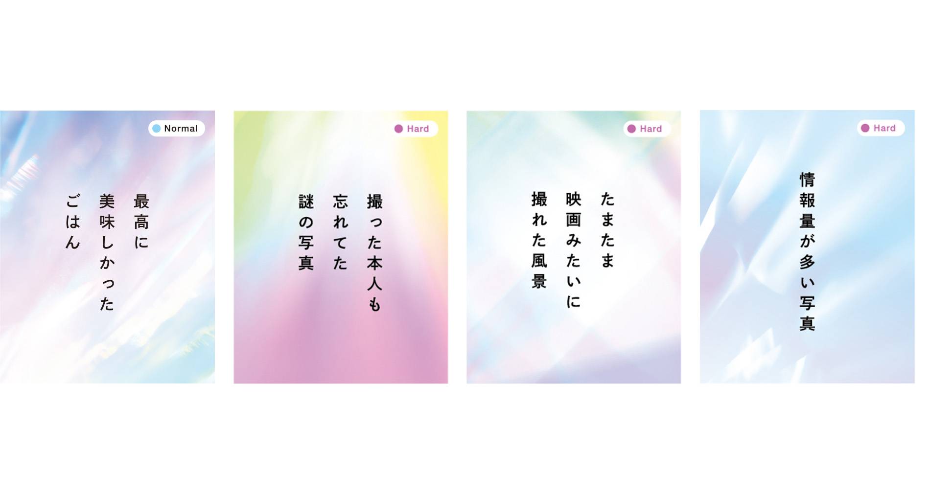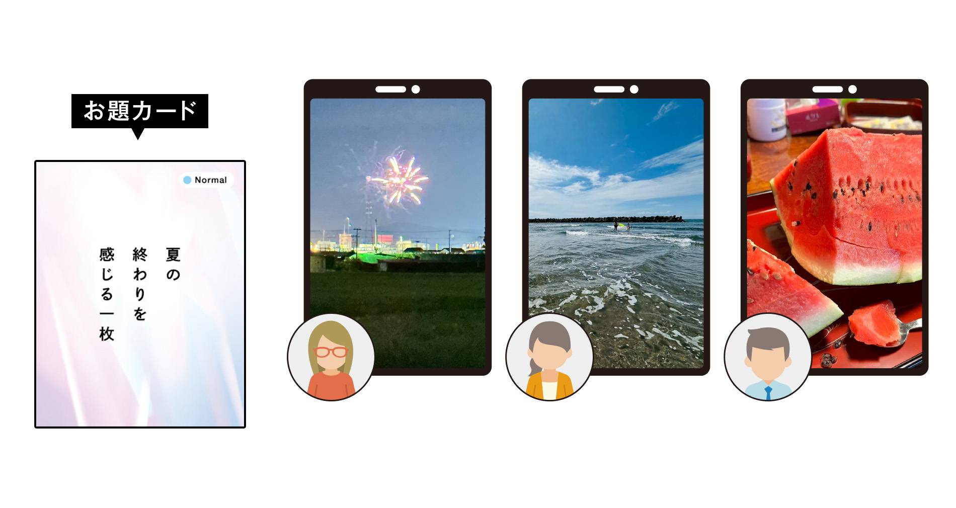 • 出題されるお題に合わせて、自分のスマホのカメラロールから写真を探し、ピッタリな一枚を発掘した人が勝ち。