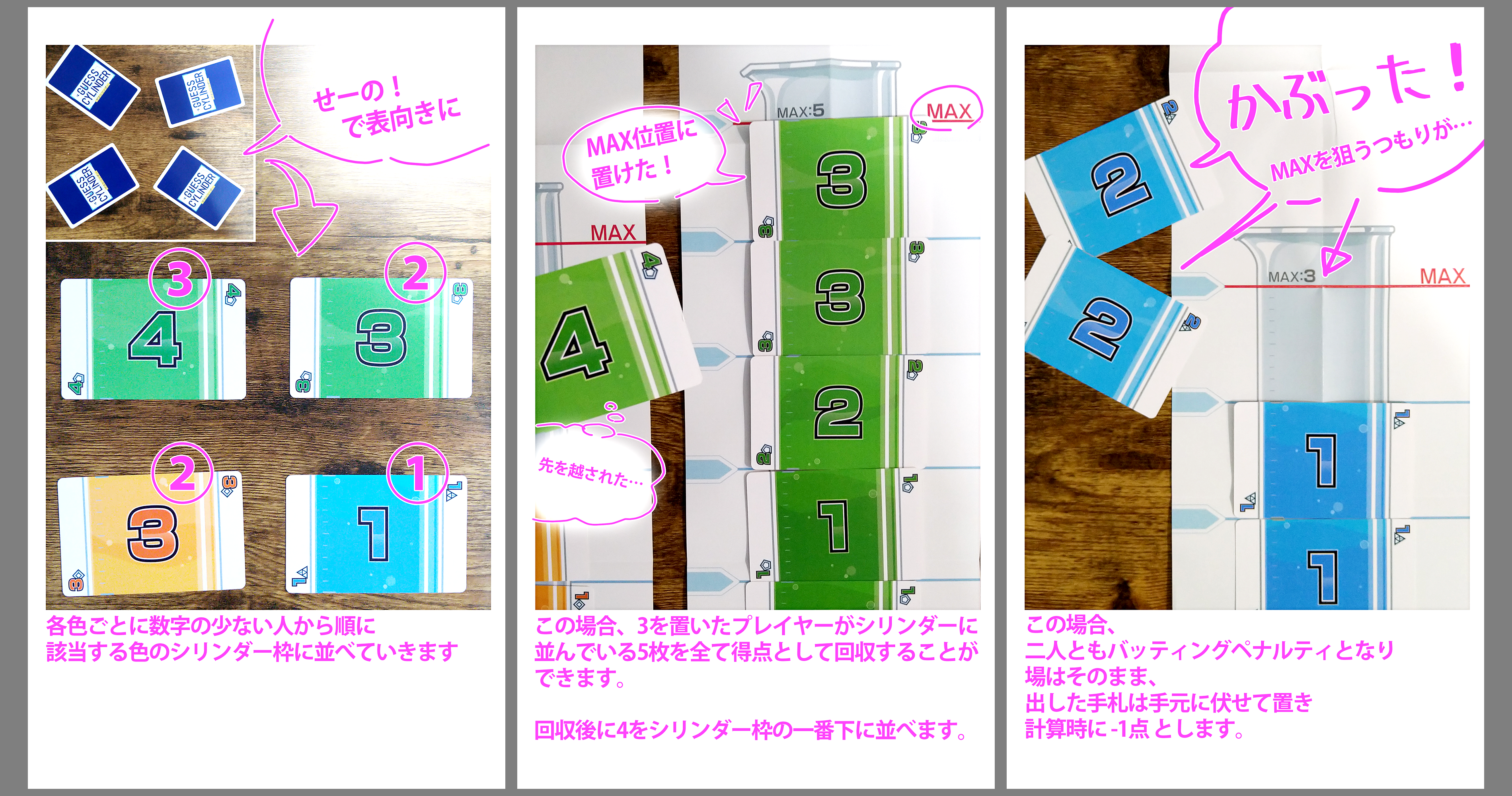 ・場のシリンダー枠に下から順に当てはまるよう出した手札を並べていきます