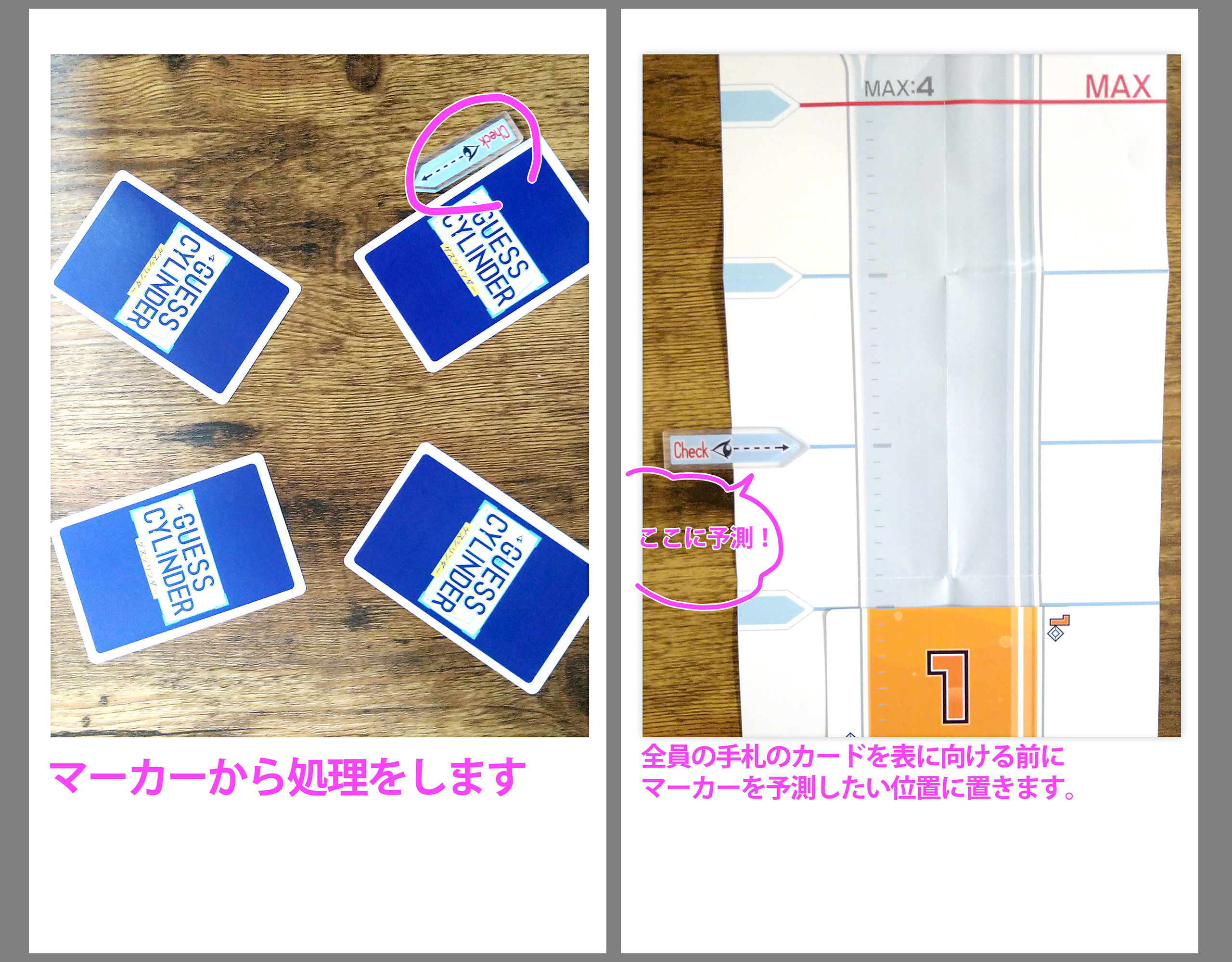 ・カードを表返す前に、場のシリンダー枠の好きな位置にCheckマーカーを置きます