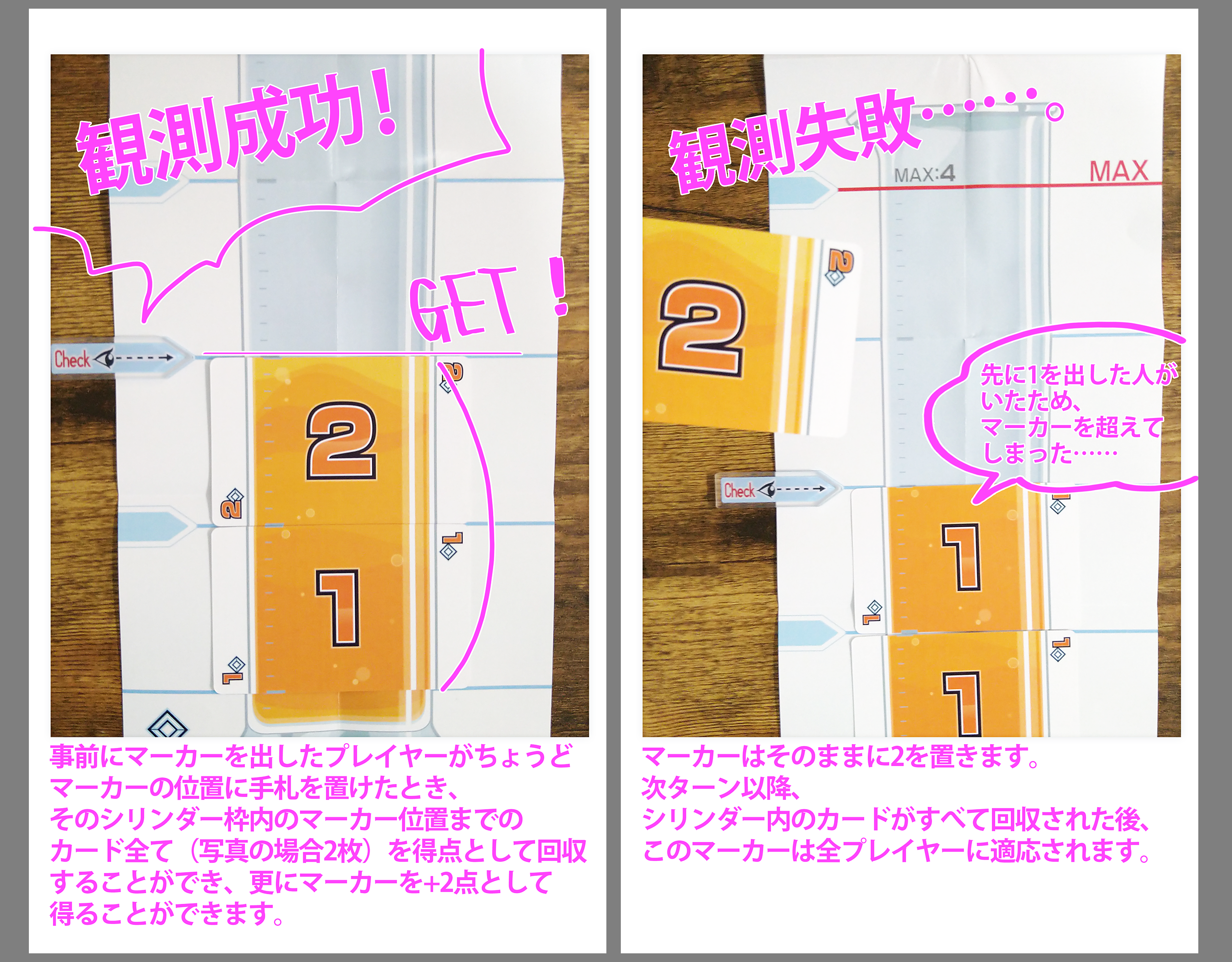 ・予測観測成功したプレイヤーは、マーカーを置かれた位置までのカードを獲得し、更にマーカーポイント+2点を得ることができます