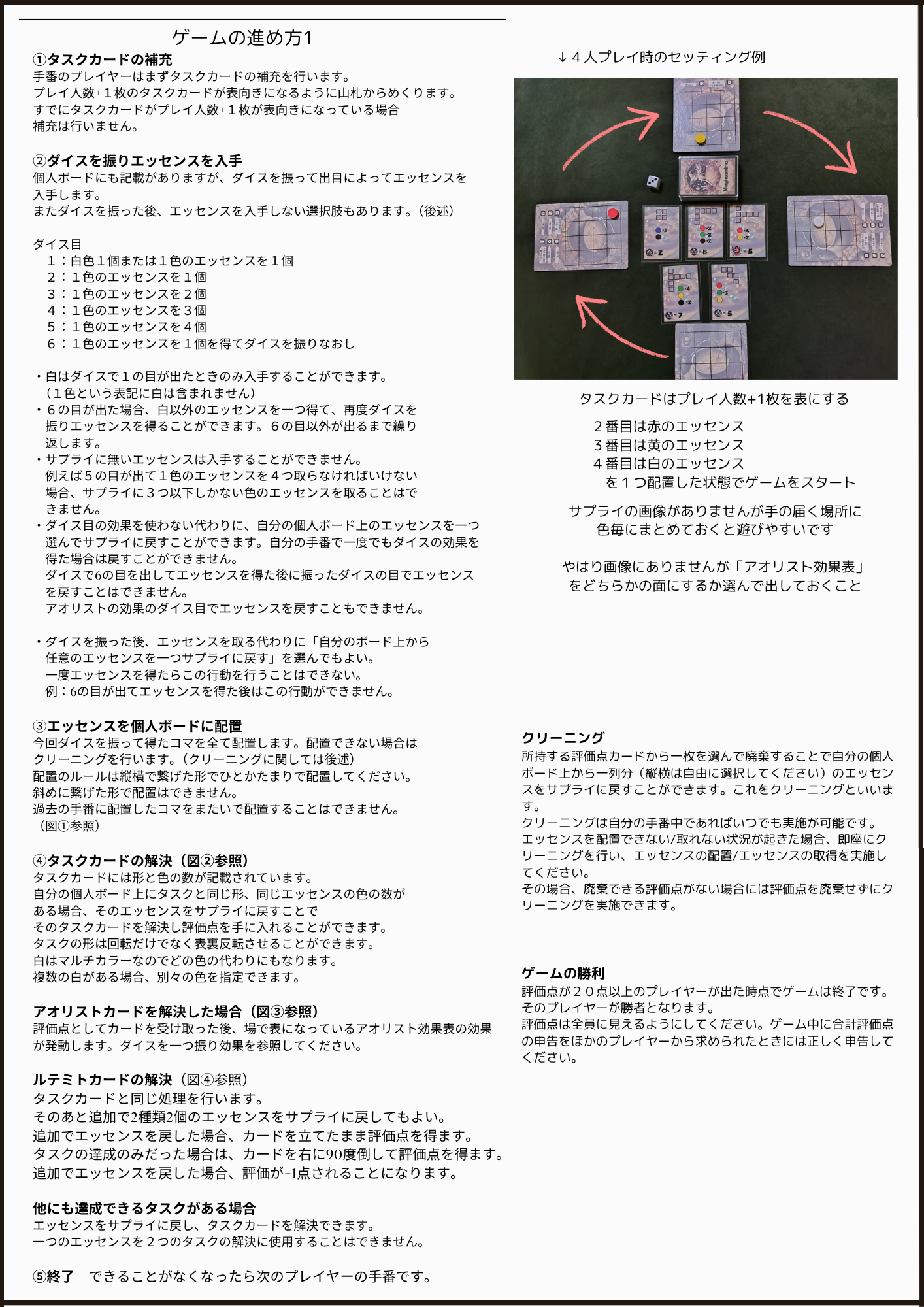 - ダイスの目によってとれるエッセンス(材料)の数が変わります。場のタスク通りにエッセンスを配置して評価点を得ます。