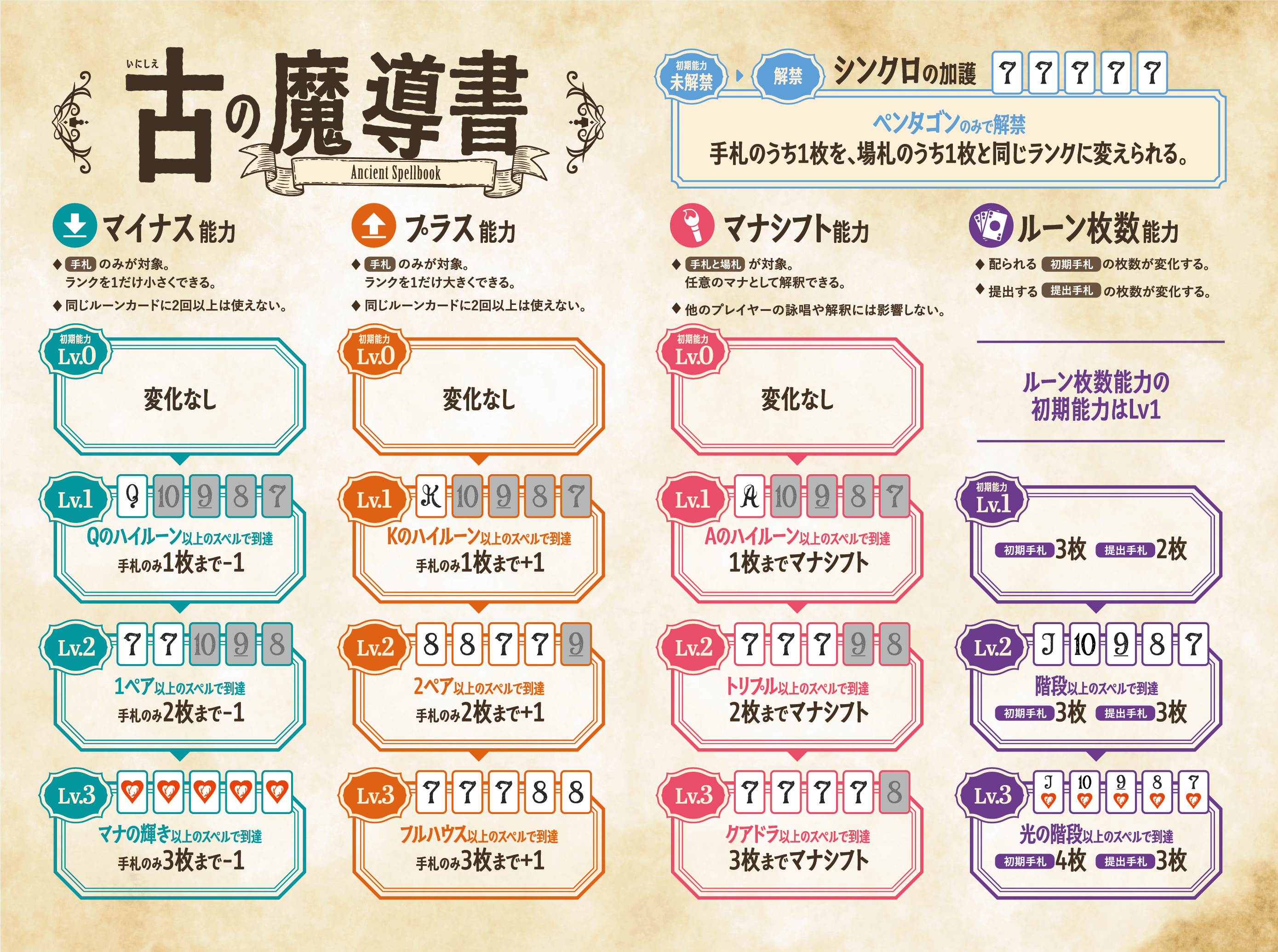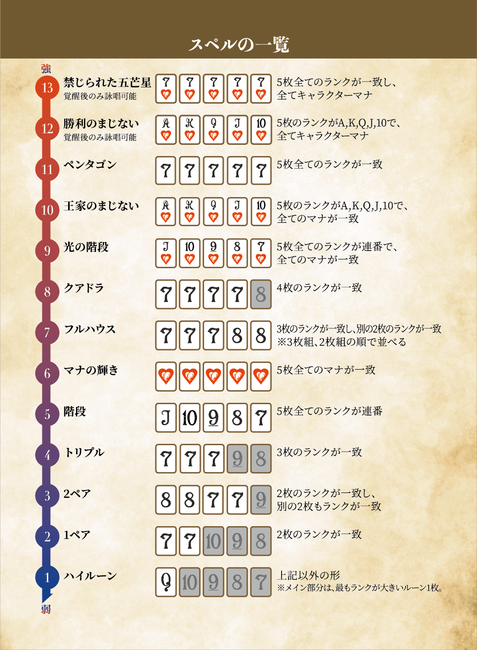 - 能力を活用して強力なスペル(役)を成立させ、更に能力を強化しましょう。