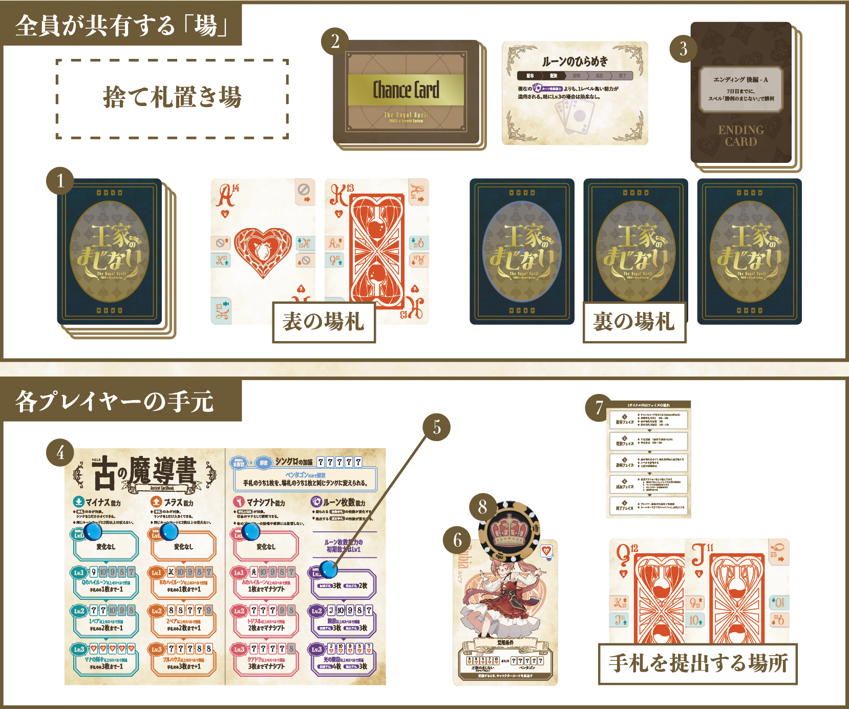 また、「場札」が数枚だけ場に置かれます。場札の枚数は、ゲームの進行状況に応じて増えていきます。