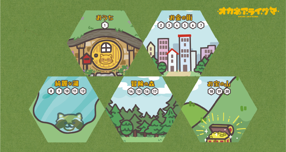 毎日いろんな場所へお散歩し、ピカピカのオカネの手がかりを集め、誰よりも早くピカピカのオカネを5個集めたアライグマの勝利となります。