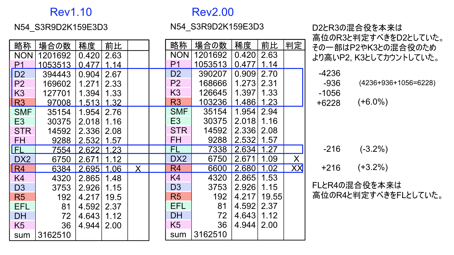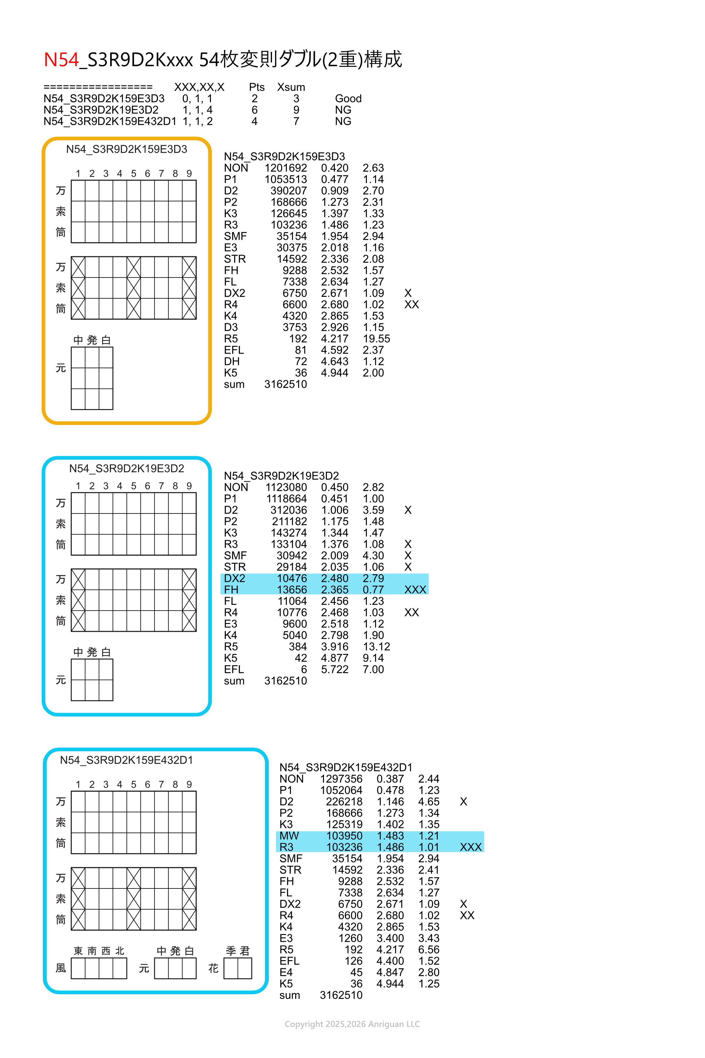 2026.02.11 役表に計算誤りがあったため全面的に修正します。PDFおよび役表の表示用画像(サムネイルも含む)をRev.2.00として更新します。特定の役を別役としてカウントしてしまう誤りであり、評価判定が変わってしまうものがかなりの割合でありますが、役順の変更までには及んでいません。誤りの詳細は以下の画像を参考にしてください。