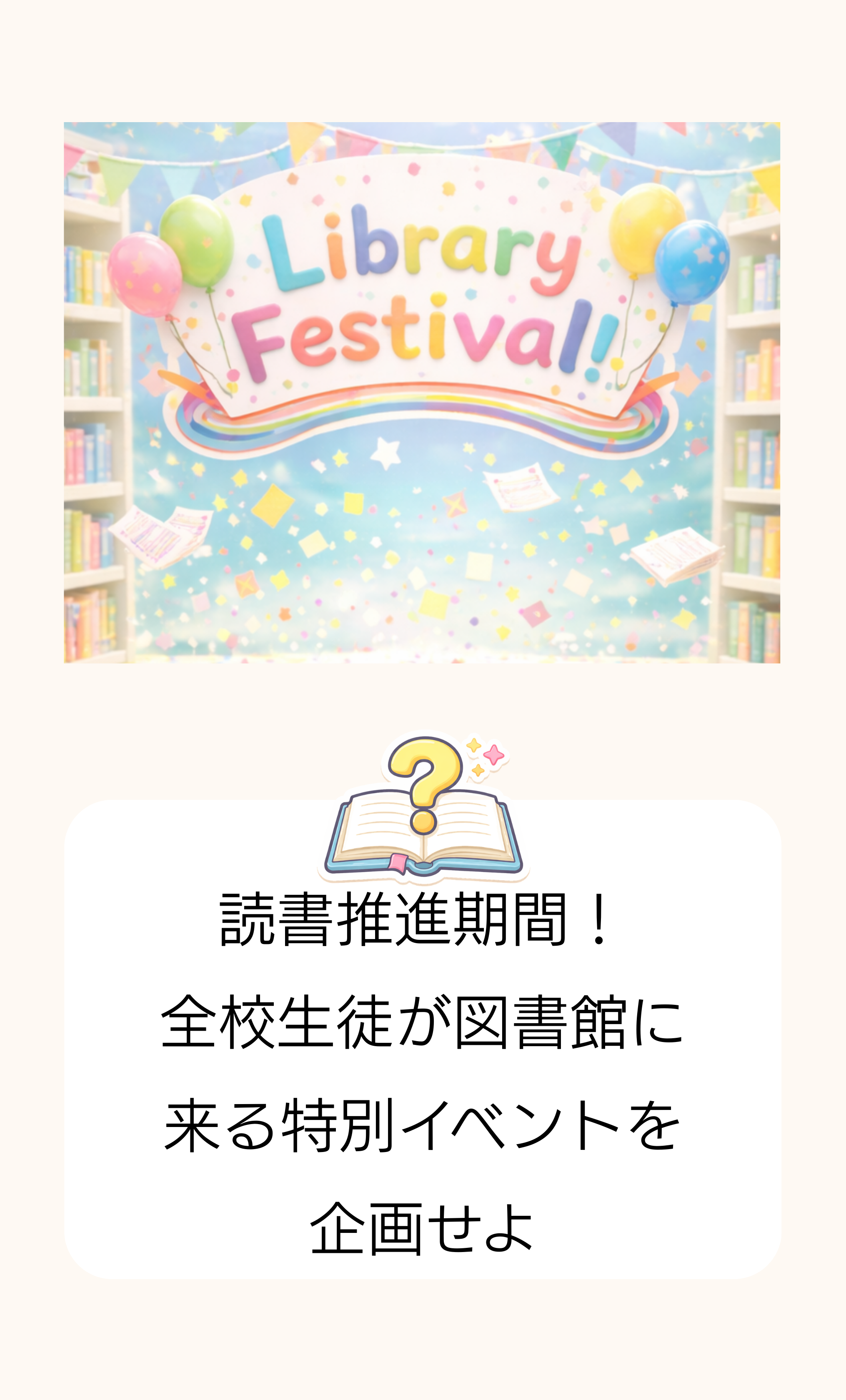例:「読書推進期間!全校生徒が図書館に来る特別イベントを企画せよ」