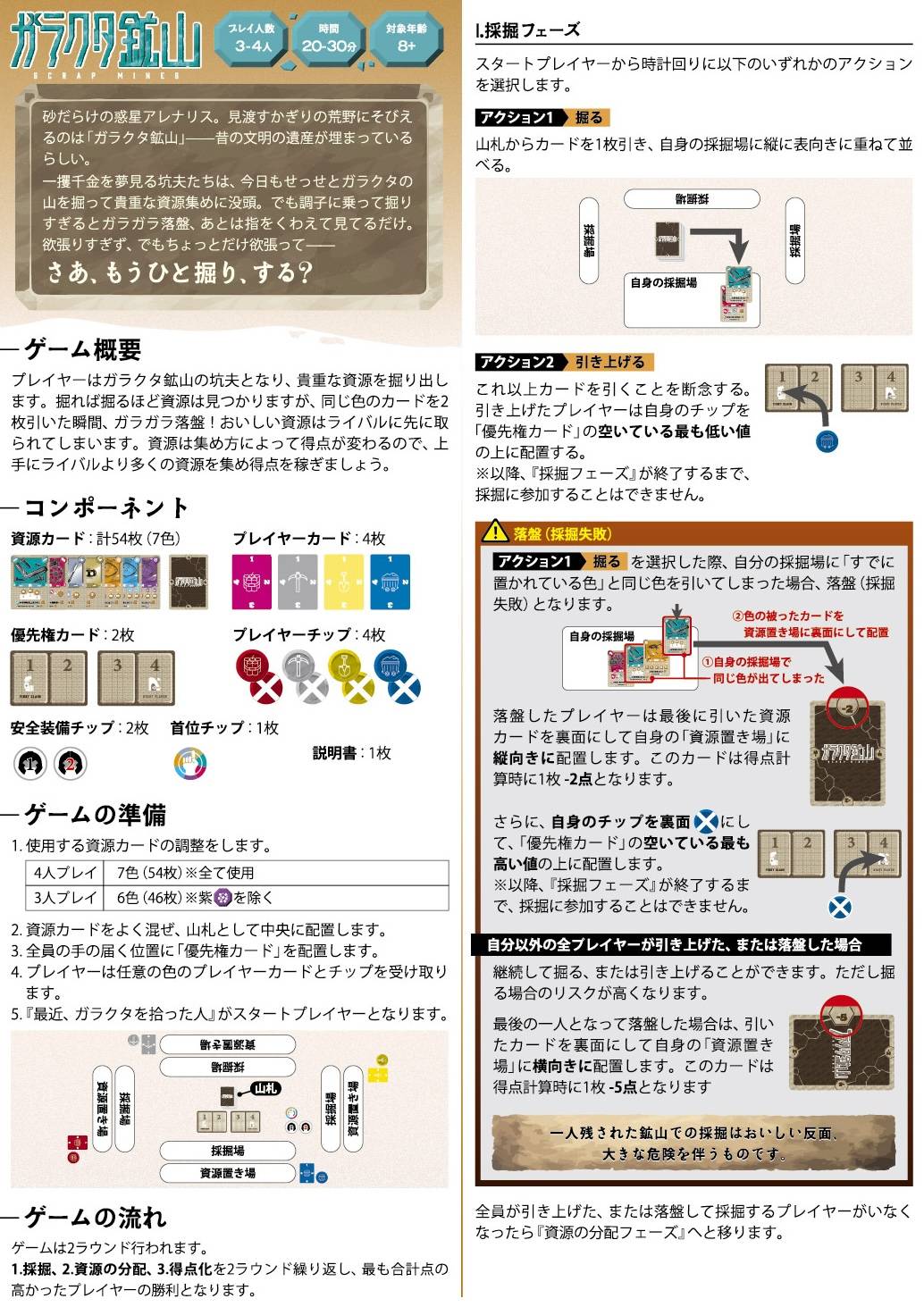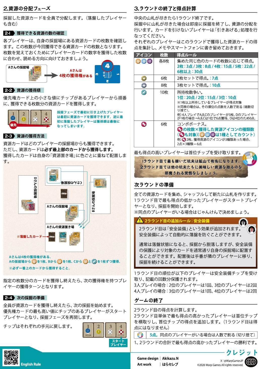 - 掘れば掘るほど資源は見つかりますが、同じ色のカードを2枚引いた瞬間、ガラガラ落盤!