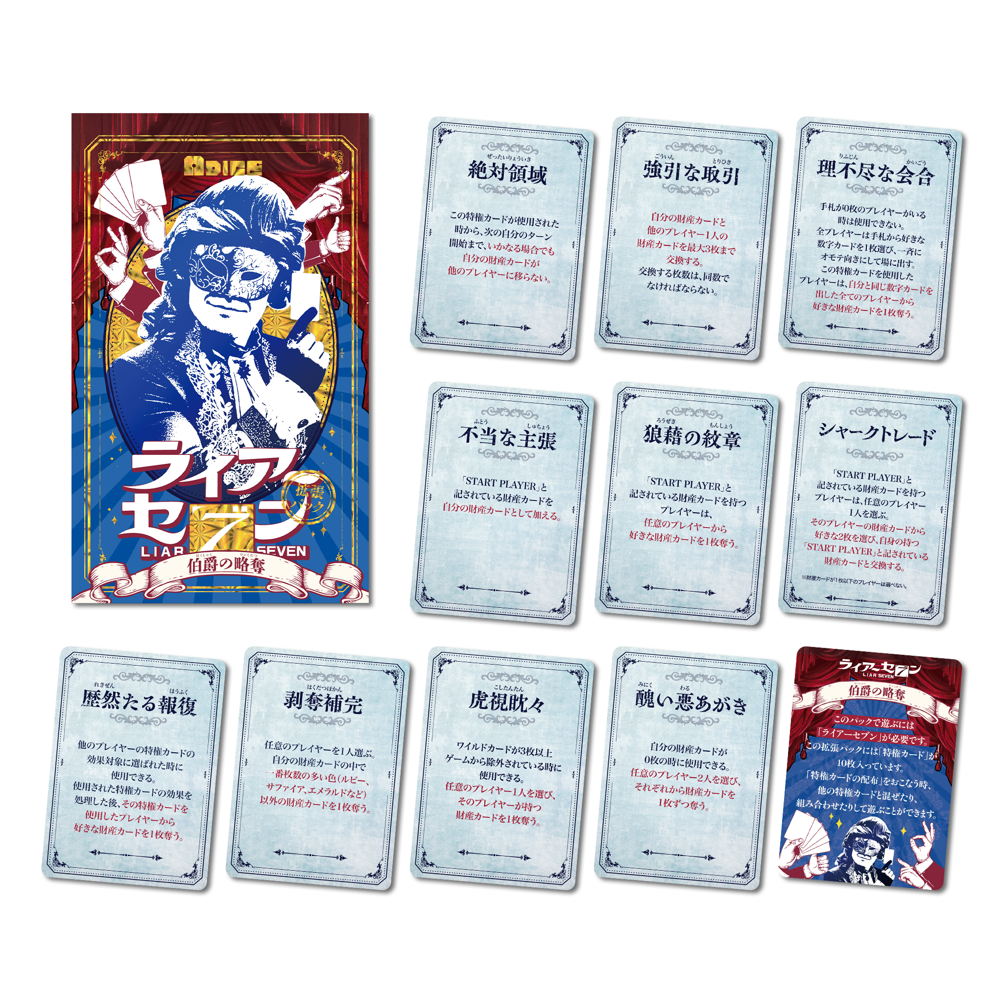 - 『ライアーセブン』の拡張パックでございます。他のプレイヤーの財産カードを奪うなど、慈悲なき特権カードを10枚ご用意しました。 豪快な略奪で、社交界を蹂躙しましょう。 ※この商品は単体では遊べません。『ライアーセブン』と合わせて遊んでください。