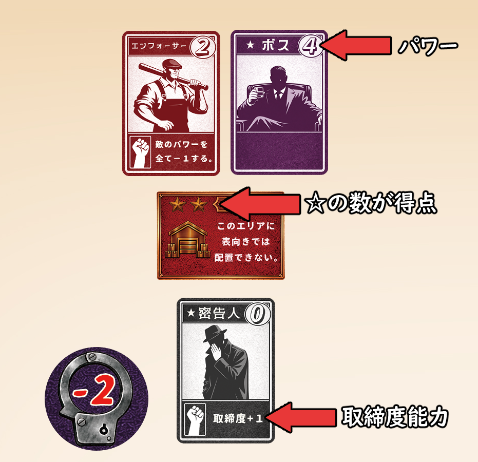 なお 同点の場合 は、最も合計パワーの高い構成員を置いているプレイヤー が取り締まりを受けてしまいます。