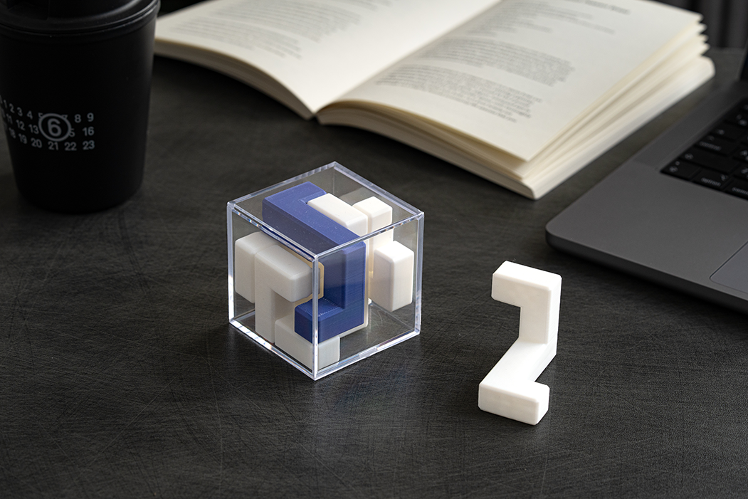 It’s a puzzle game where you fit six identical pieces into a transparent case.