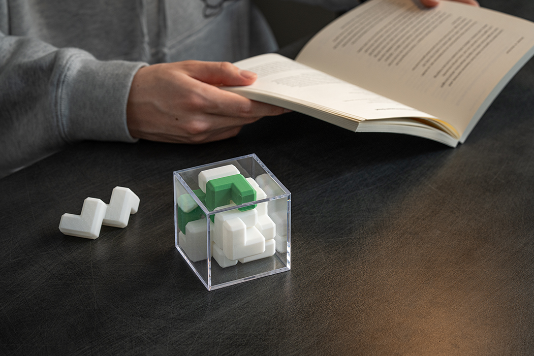 It’s a puzzle game where you fit six identical pieces into a transparent case.
