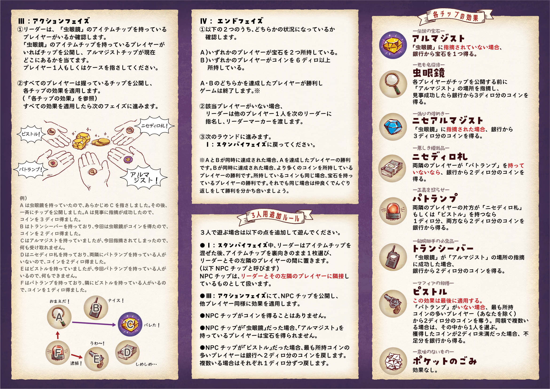 ・宝石トークン7個 ・コイン19枚 ・説明書2枚 ・サマリーシート2枚 ・パッケージシート1枚