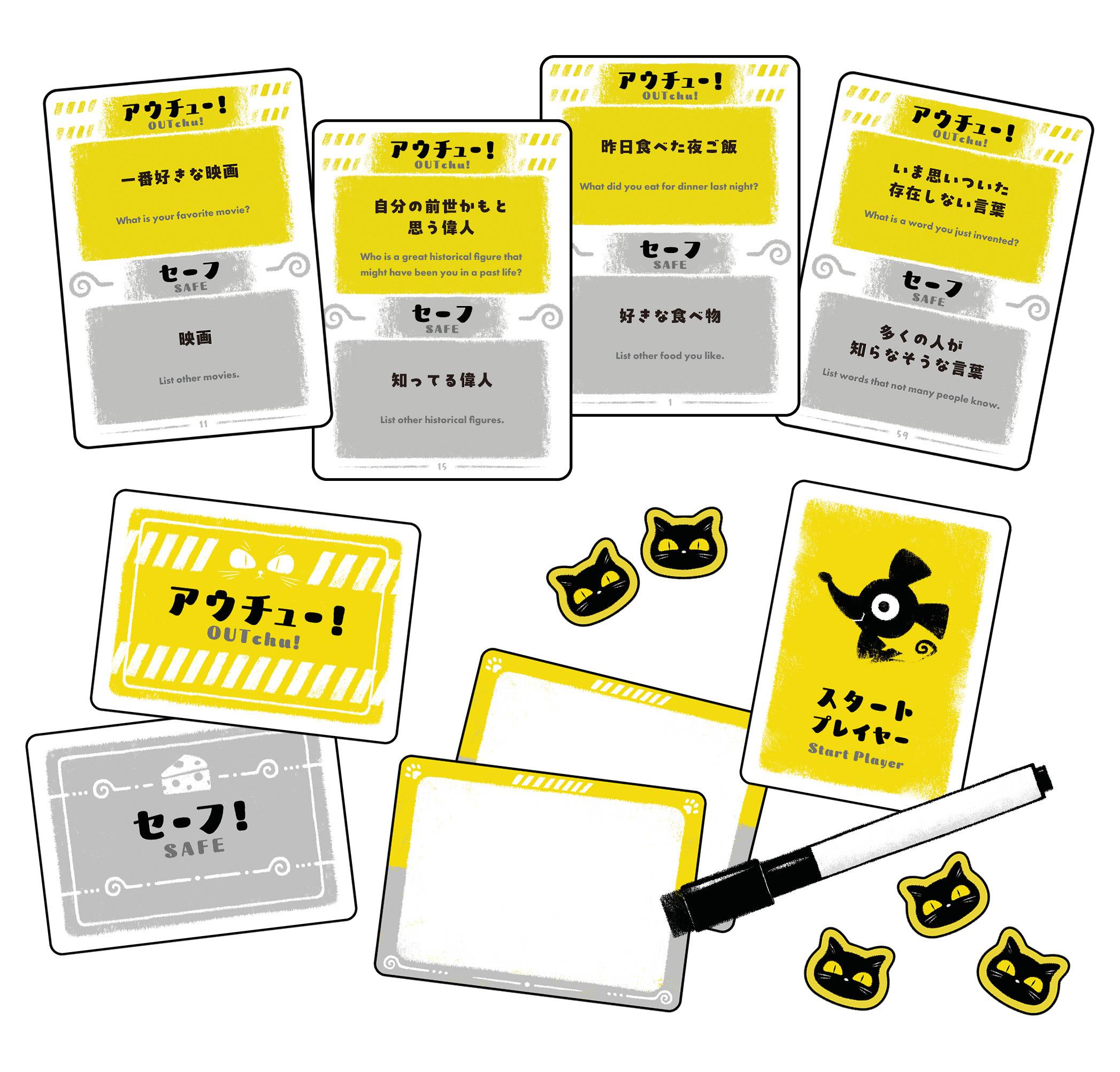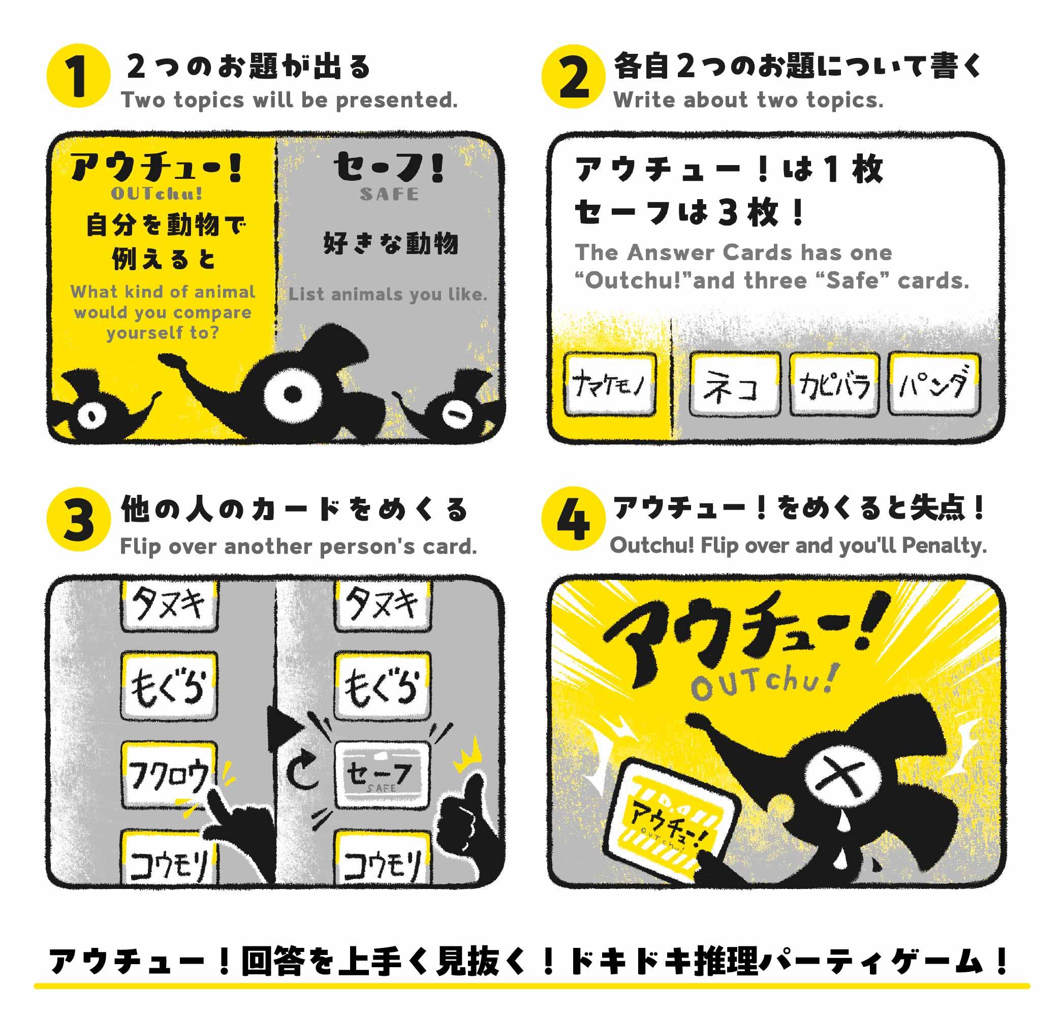 - 『これがアウチュー!』は、各プレイヤーが4枚の記入カードに「セーフお題」と「アウチュー!お題」を書いて遊ぶゲームです。 その後、他の人の書いた答えを見ながら、「セーフお題」だと思うカードをめくっていきます。 もし「アウチュー!お題」をめくってしまうと、失点を受けてしまいます。 ゲーム終了時に、最も失点の少ないプレイヤーの勝利です。 他の人の答えを推理する楽しさや、ゲームだからこそ見えてくる意外な一面を、楽しんでみましょう!