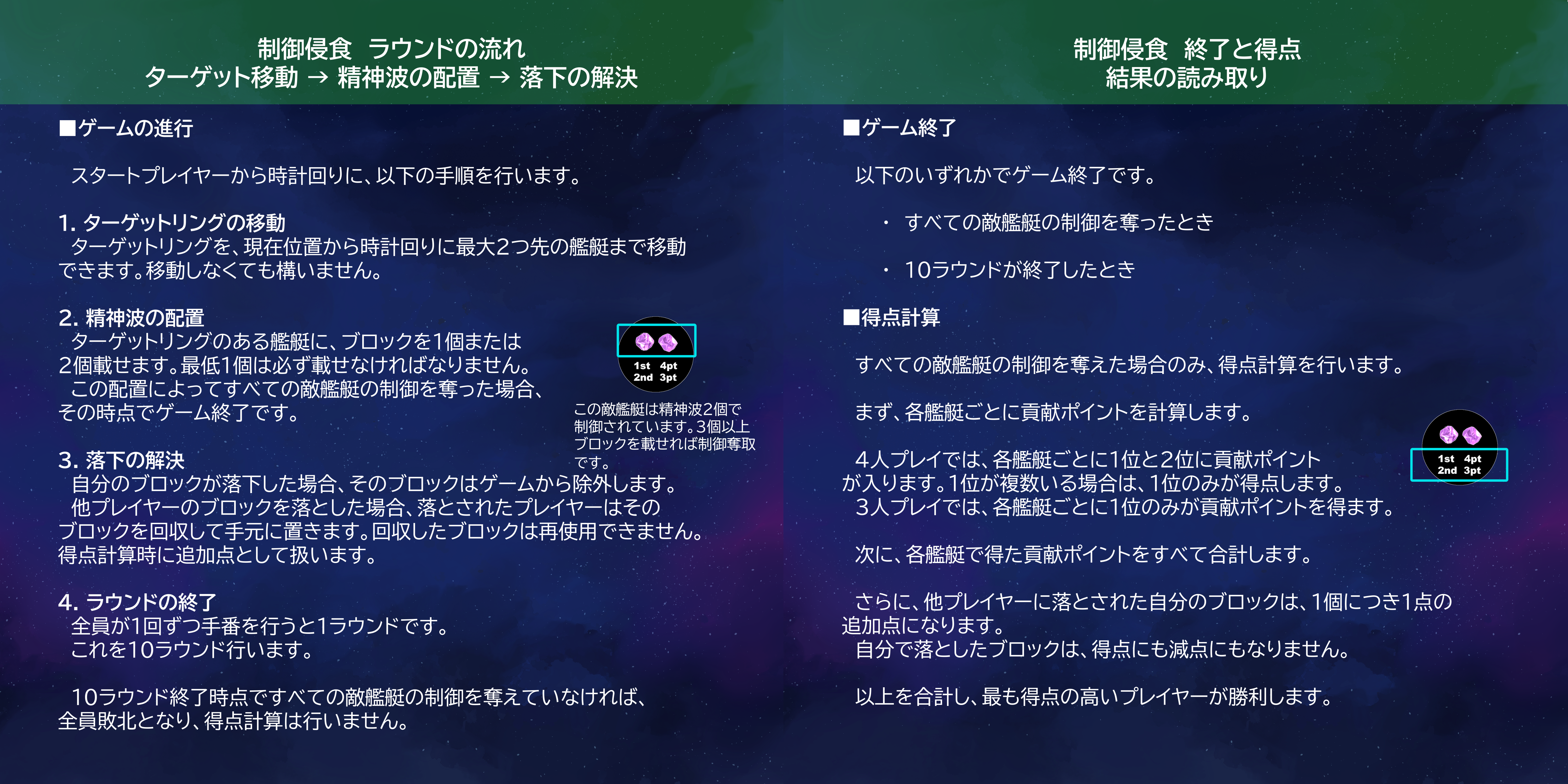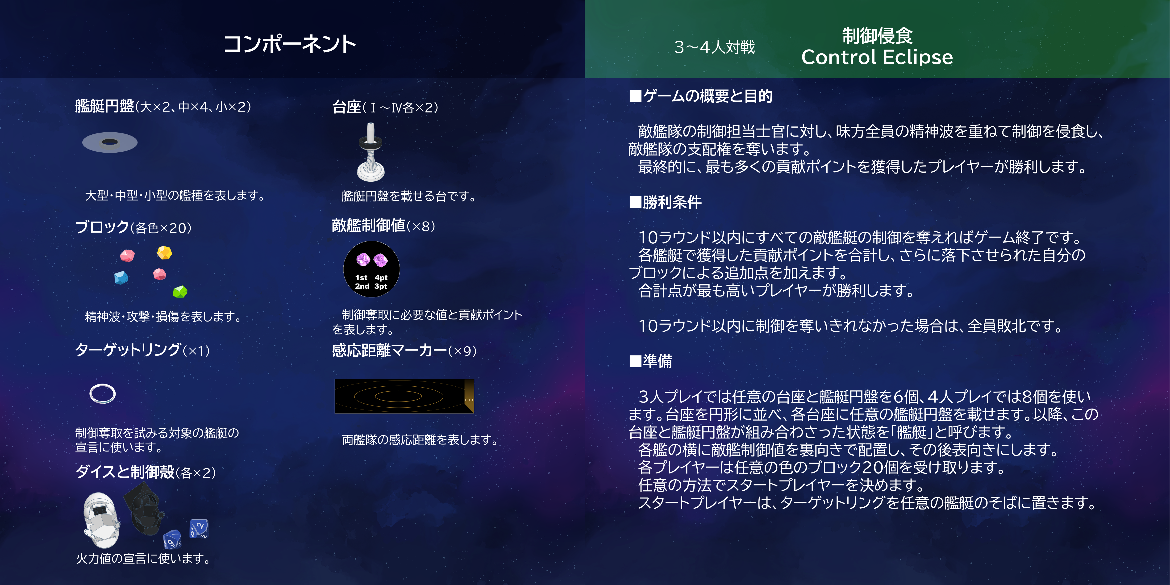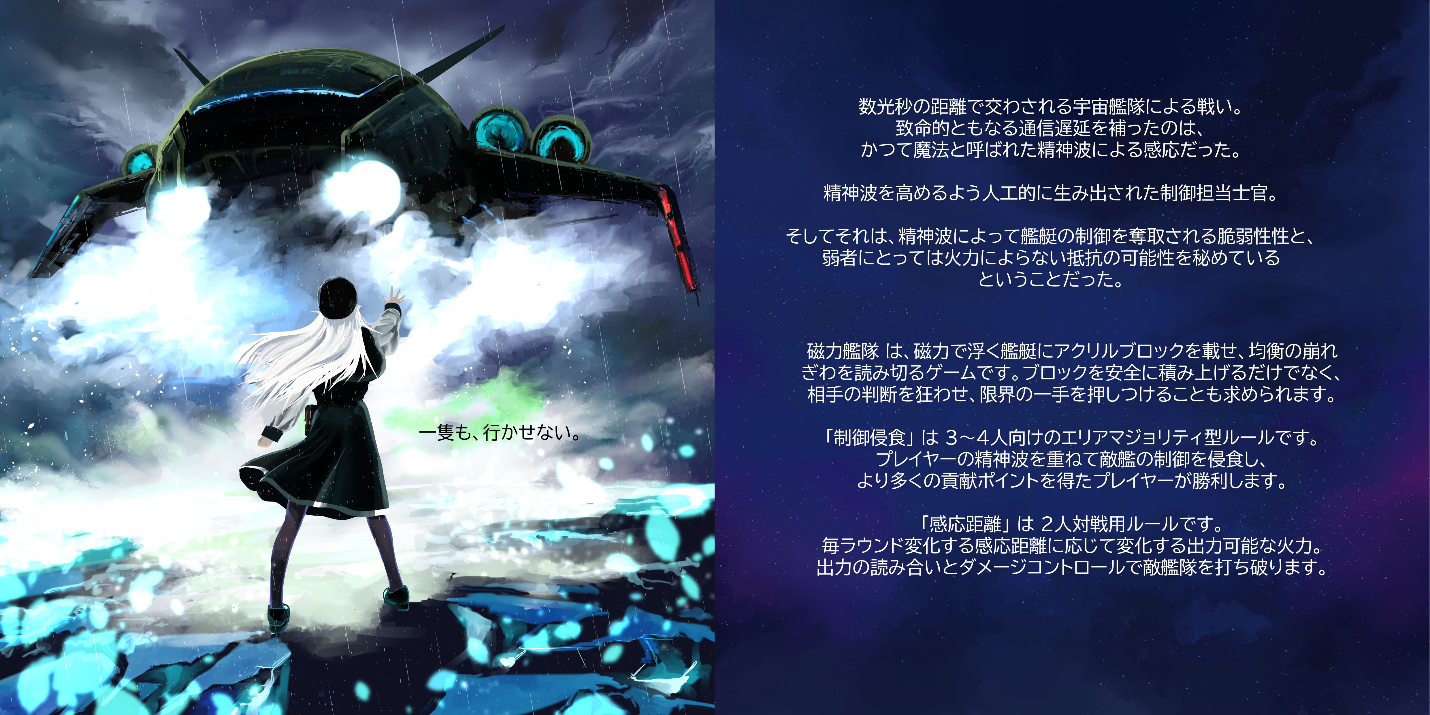 - ■3~4人対戦 アクリルブロックを磁力で浮く円盤に配置し、協力して敵艦の制御奪取を目指すエリアマジョリティゲーム。予測不能に揺れる円盤。ひとつのミスがすべてを崩壊させます。 戦略と器用さを武器に、勝利と最多貢献を目指しましょう。