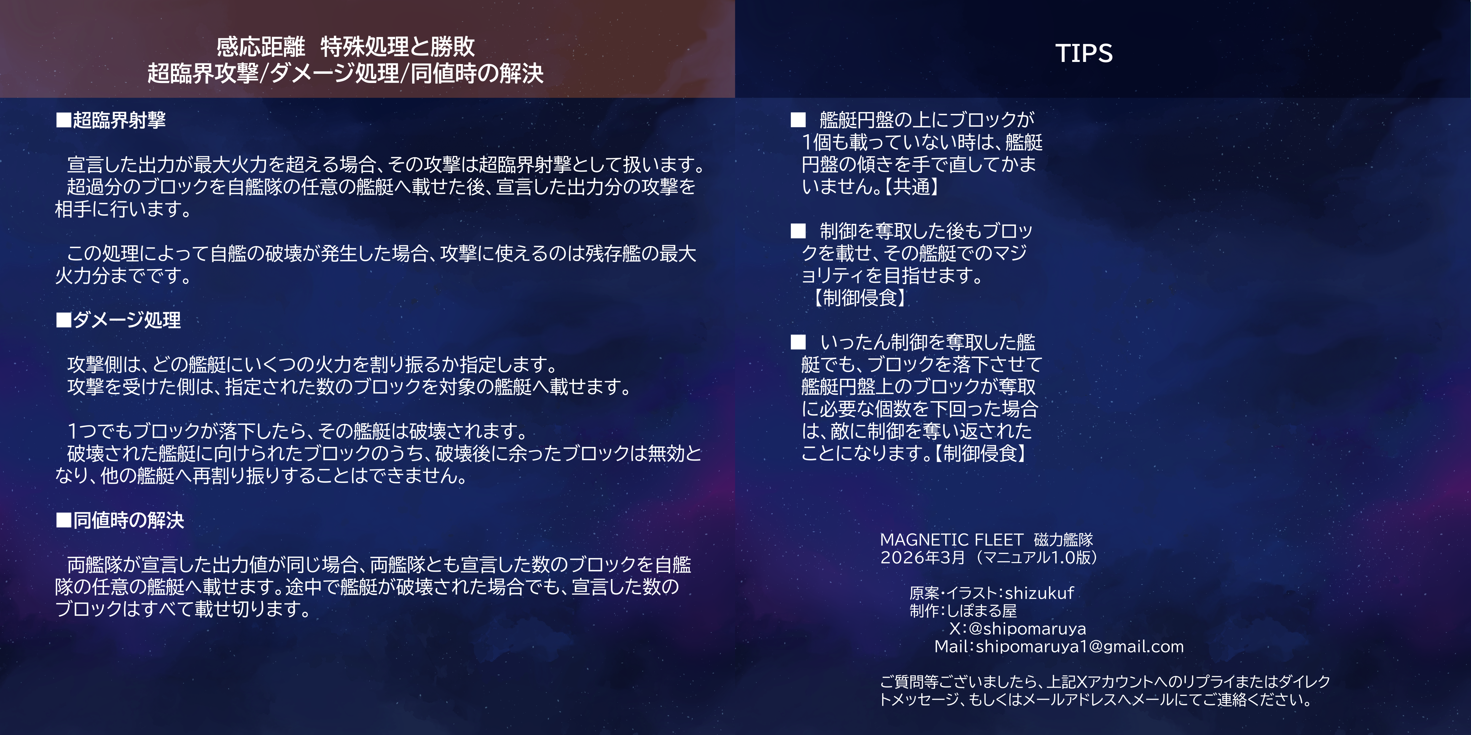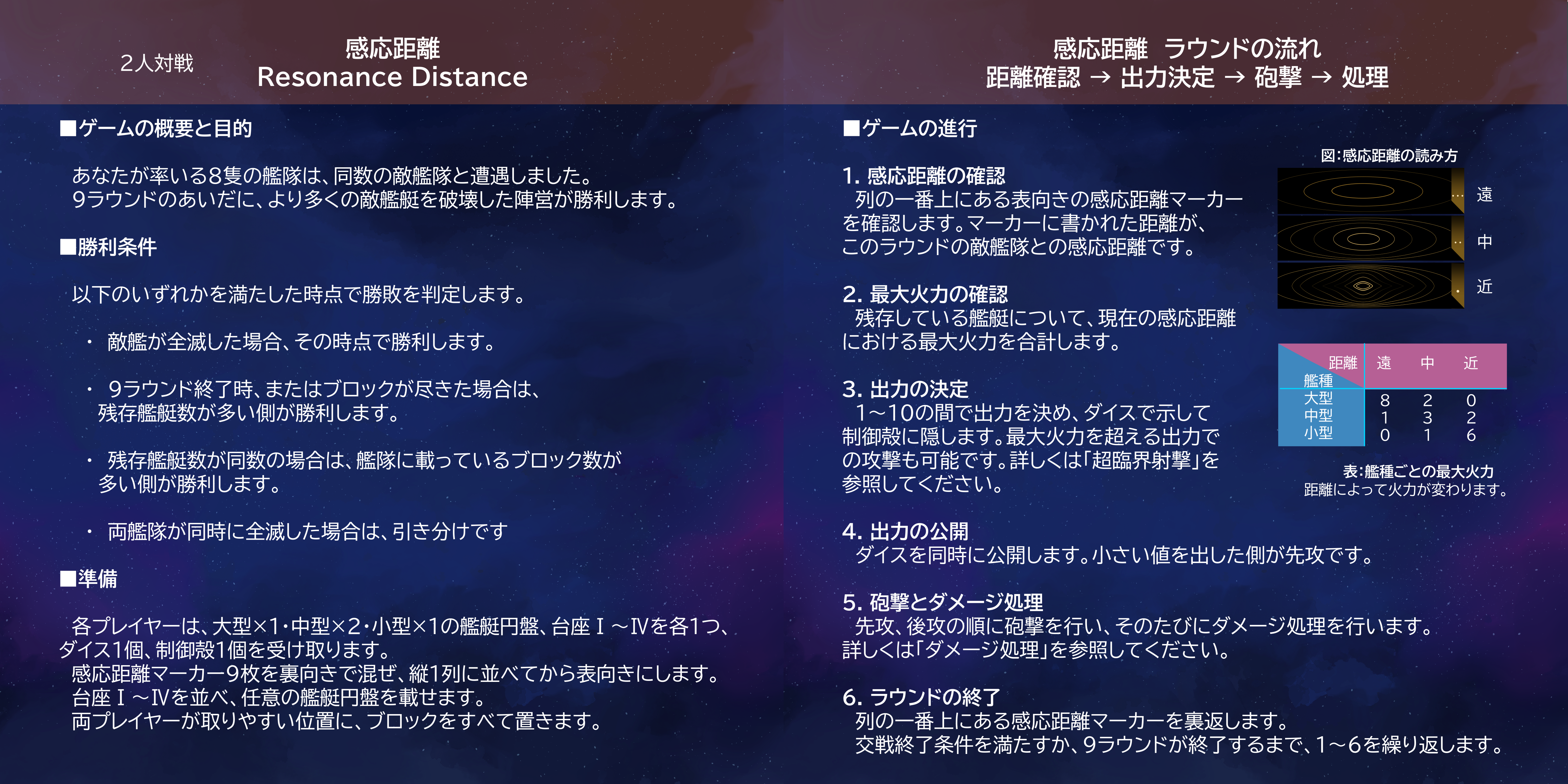 - ■2人対戦 読み合いとダメージコントロールが重要な艦隊戦。毎ターン火力を選択し同時公開。低火力が先攻となり打撃を与えます。揺れる盤面の緊張感と、駆け引き。 “物理”と“思考”がぶつかる新感覚の対戦ゲームです。 プレイ人数:2~4人 プレイ時間:10~20分 メカニクス:バランス/エリアマジョリティ