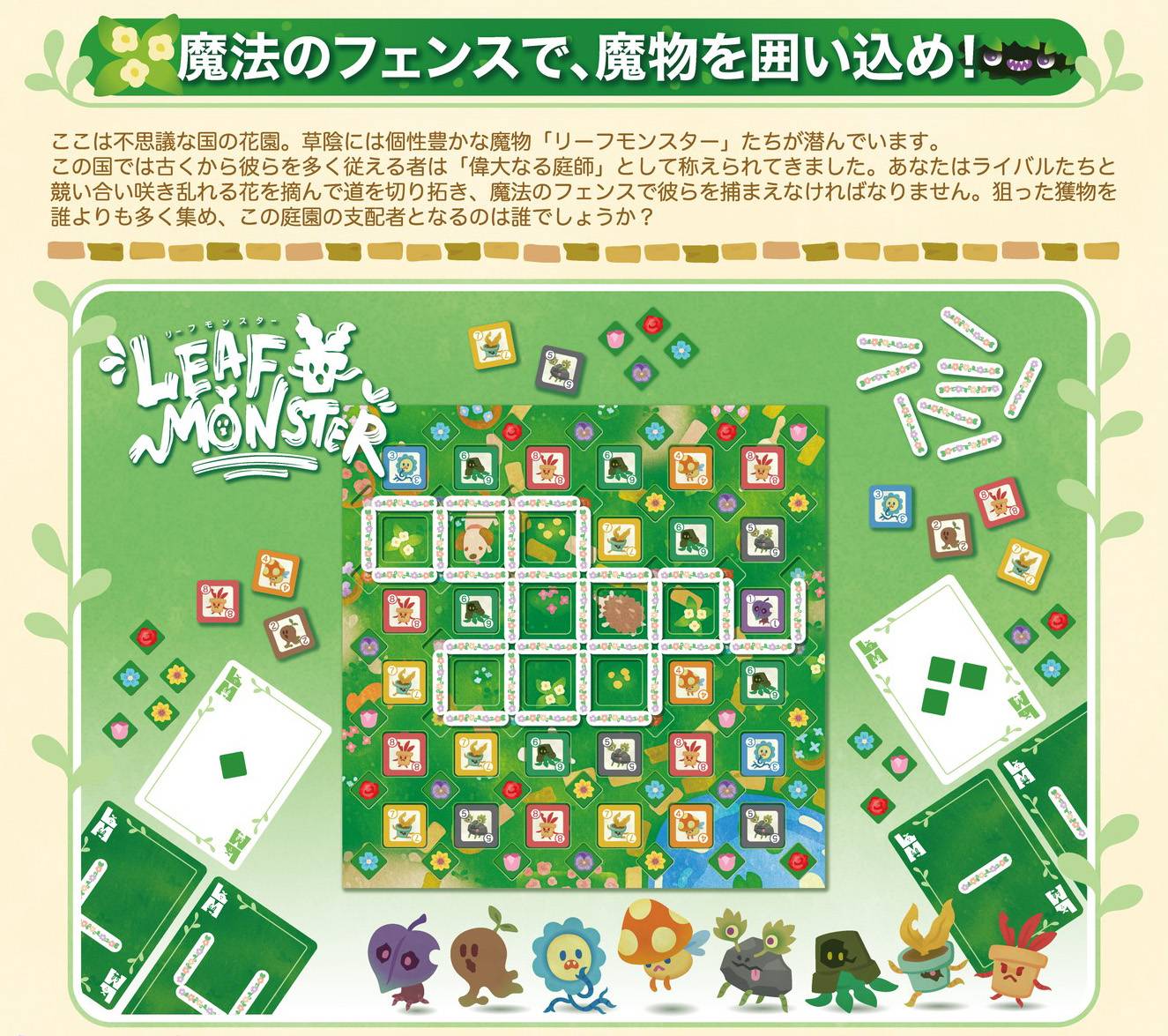 2022年発売の「菓子道」、2024年の「CRAFT BEER FET(クラフトビールフェス)」に続き佐藤雄介氏、FREAKY-DESIGNさんがタッグを組んだ第3弾「LEAF MONSTER(リーフモンスター)」を2026年ゲームマーケット春に先行発売します。
