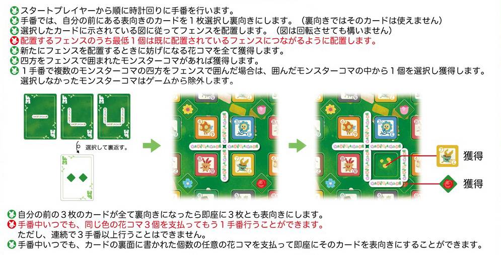 - カード(フェンス)を置くともらえる花コマを上手く使ってゲームを有利に進める事ができます。
