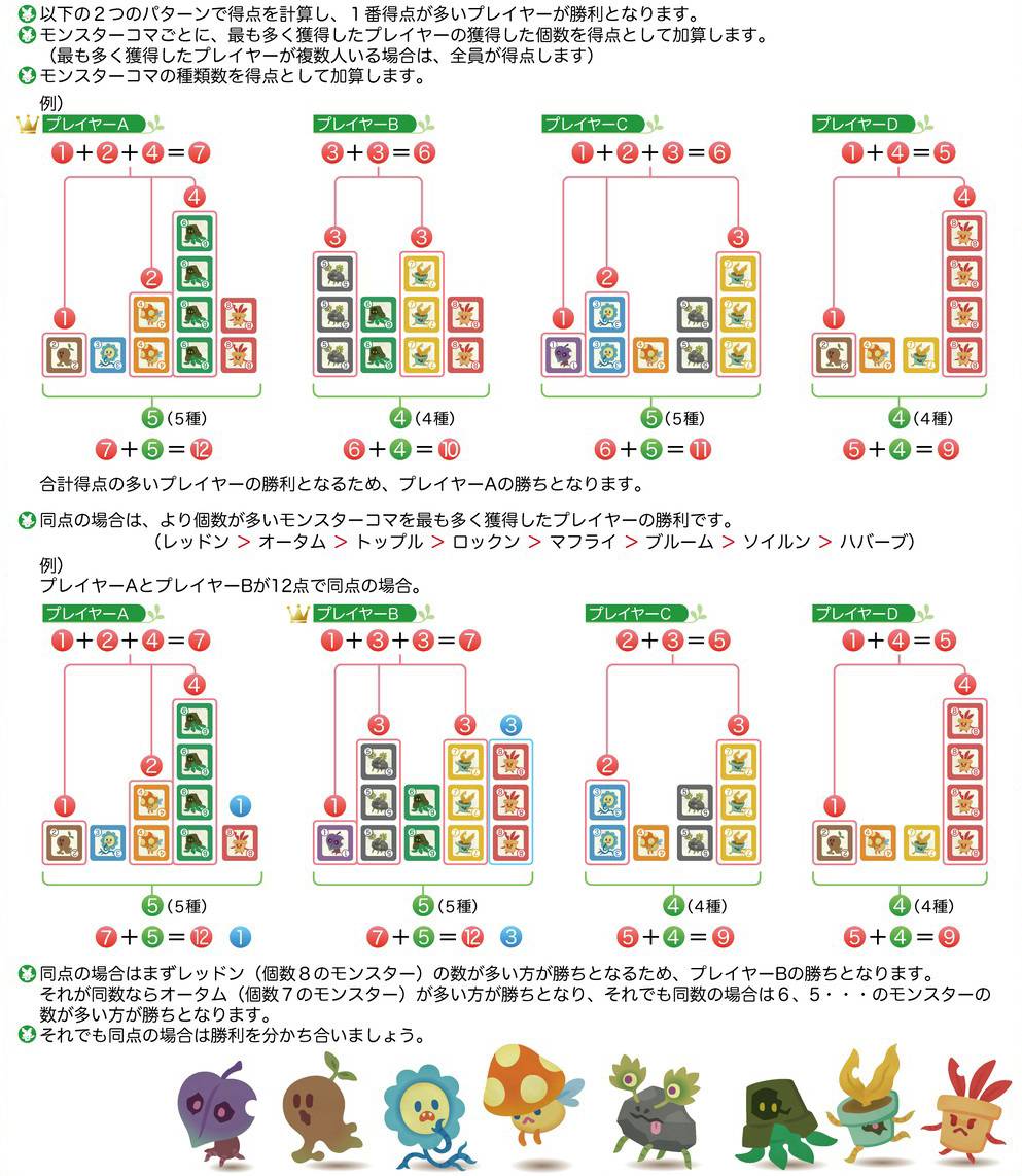 - 得点集計は魔物の種類点とマジョリティ点(1番多く獲得した魔物の数)のみのシンプル設計です。