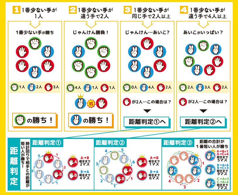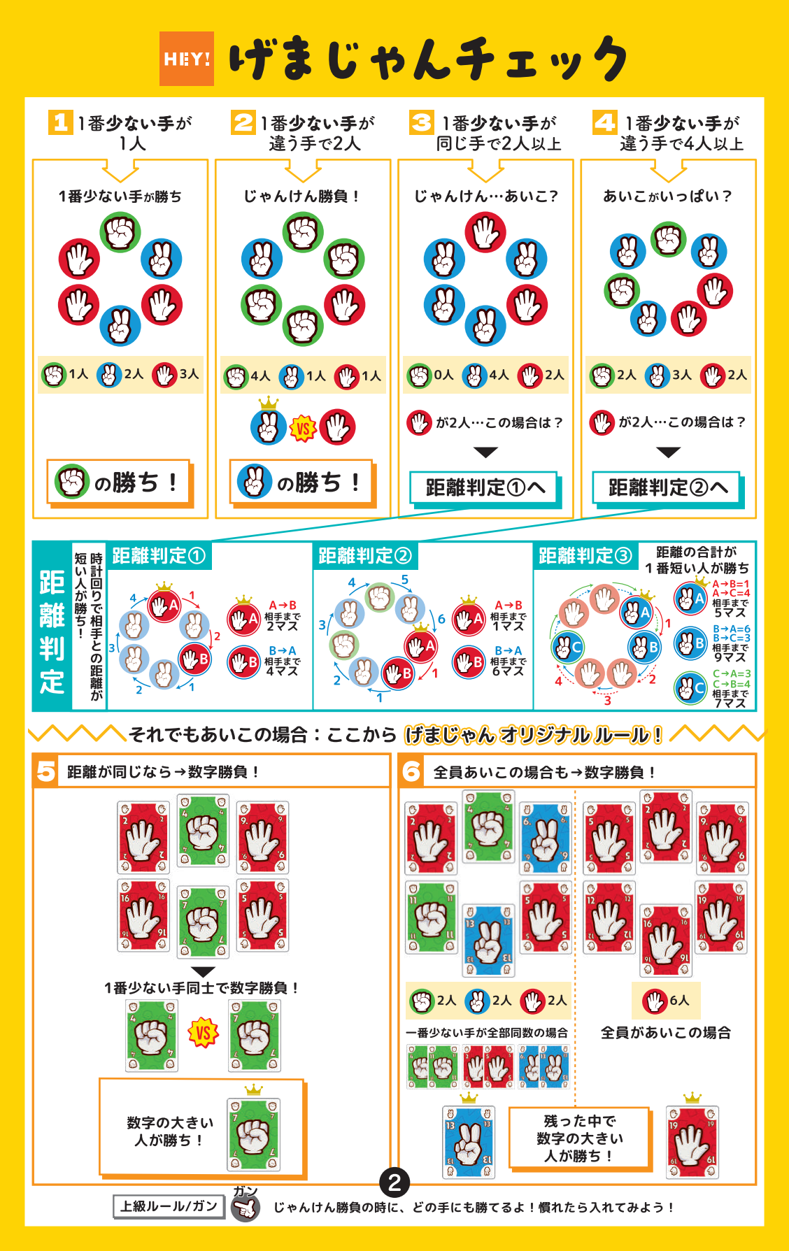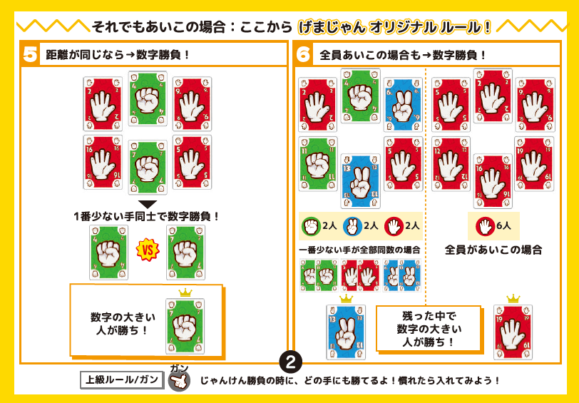 「げまじゃん」では、カードにじゃんけんの手(グー・チョキ・パー)に加えて数字が描かれており、 同じ手を出した人が複数いるときは、距離判定で勝敗を決め、それでもあいこの時は数字の大きいカードが強いというルールで決着します。