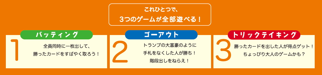 - バッティング・ゴーアウト・トリックテイキングの3ゲームが1つに収録。