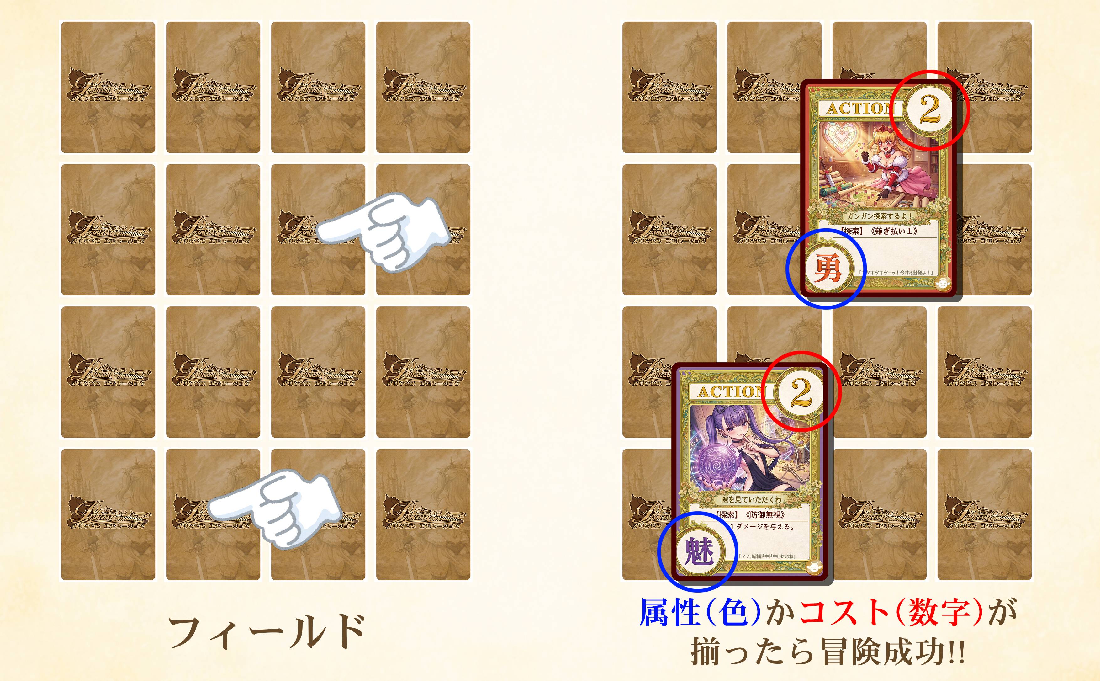裏向きのカード(フィールド)から2枚を選択。表にして、カードの属性(色)かコスト(数字)が揃っていたら冒険成功!その場でカードの効果が発動し、使用後は自身の墓地に送られてデッキに追加されていきます。 この選択が物語を作り、軌跡がデッキとなり姫を成長させます。 冒険に失敗してもリソースとなるGが手に入るので選択は無駄になりません♪