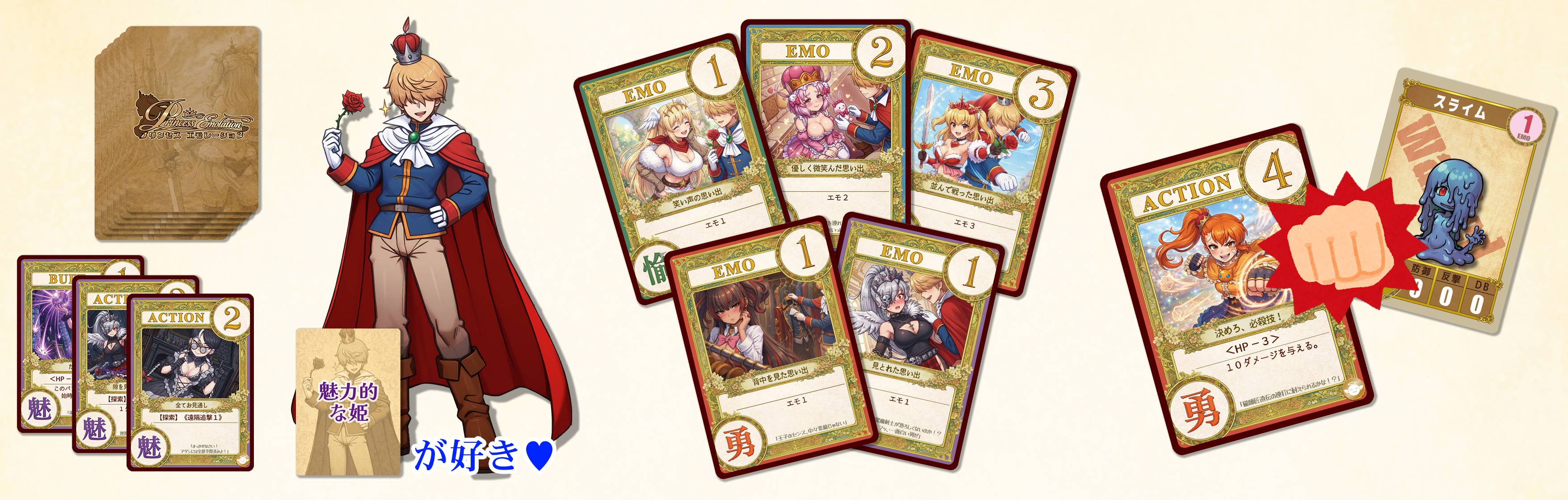 プリンセスエモレーションは《神経衰弱×デッキビルド》を組み合わせたお姫様育成カードゲームです。