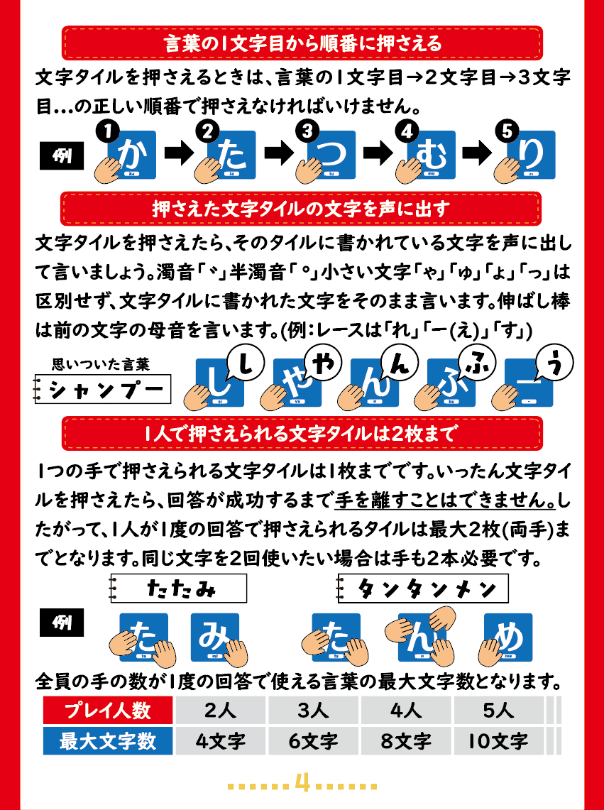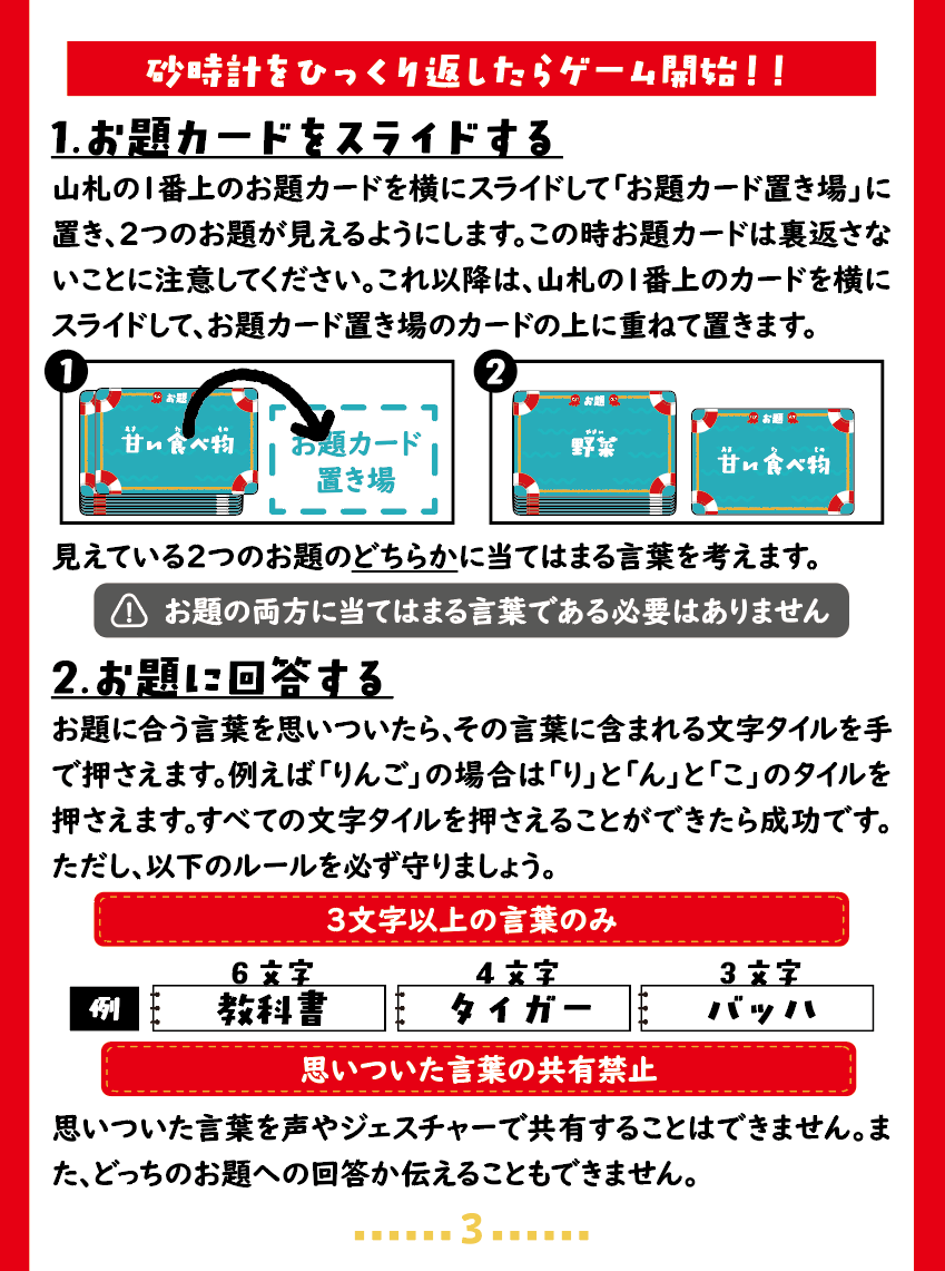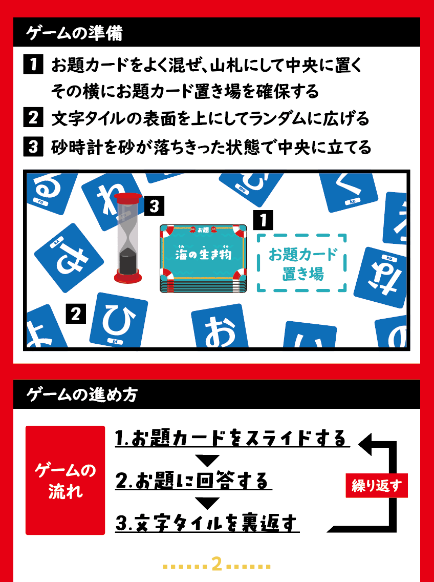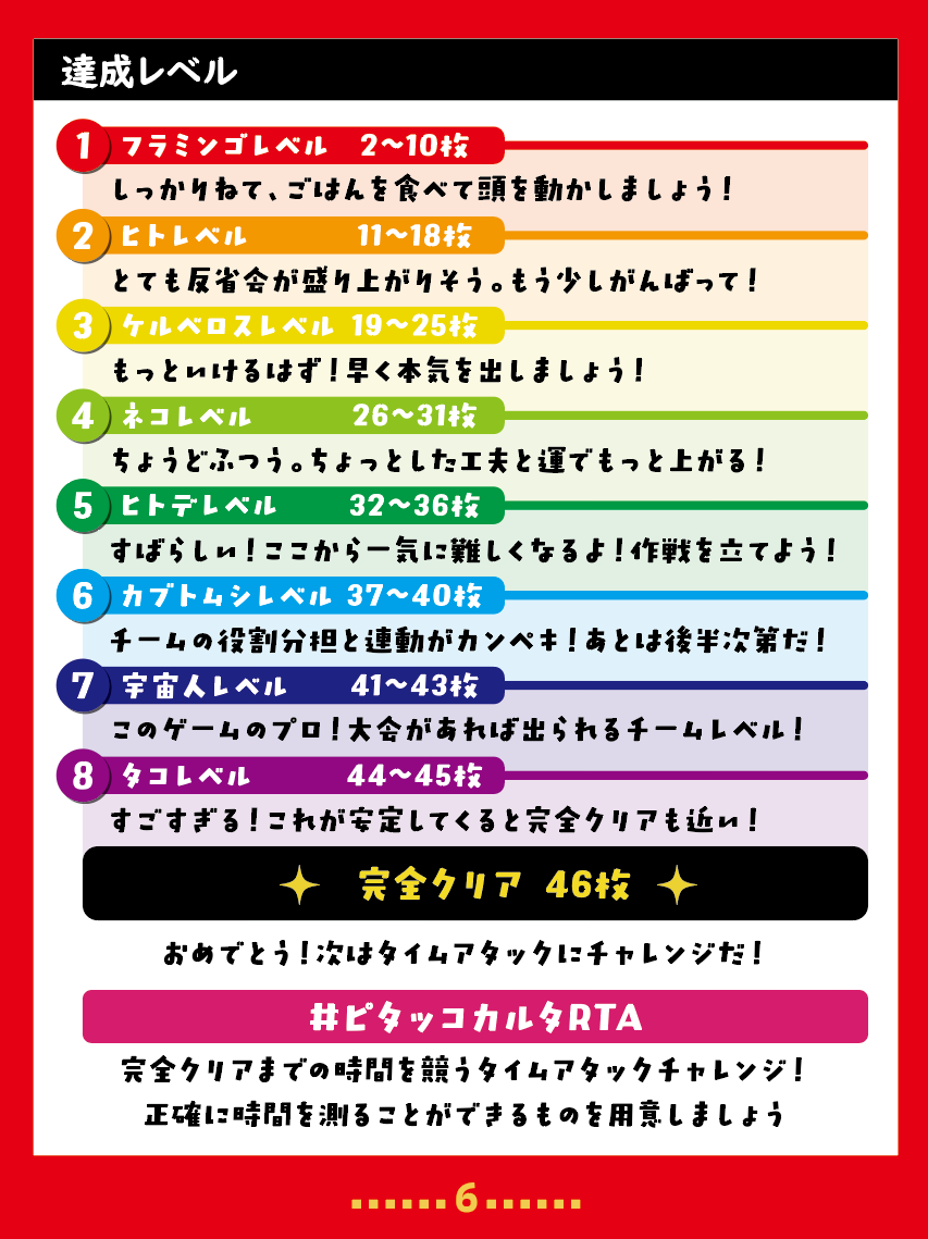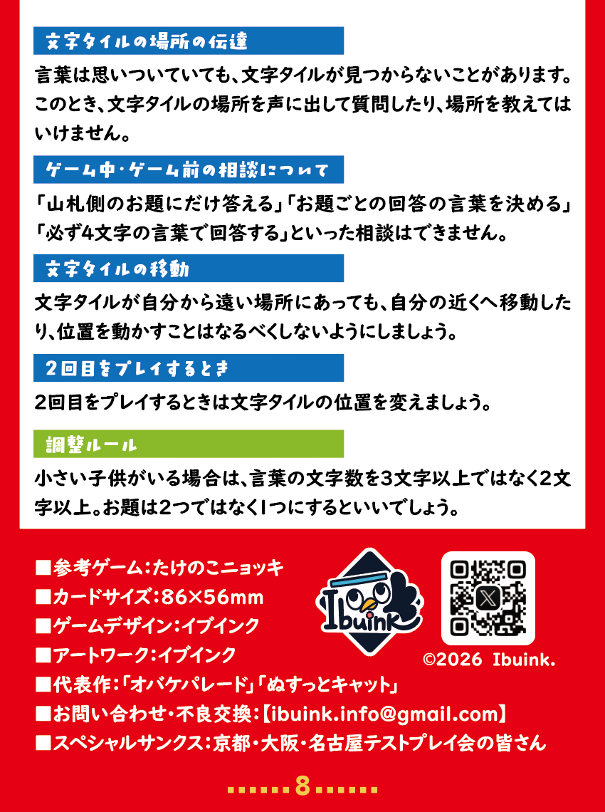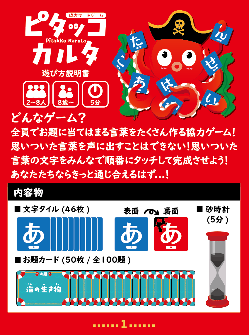 2025秋 両 - H36 2025春 両 - E02 イブインク @Ibu_ink 2026春 2-8 5-5 8歳〜 ピタッコカルタ ¥2,000 協力 その他 ピタッコカルタ ゲーム概要 プレイ人数 2〜8人 プレイ時間5〜5分 対象年齢8歳〜 価格2,000円 発売時期2026春 予約 不可 ゲームデザインイブインク イラスト・DTPイブインク ゲーム詳細 この記事をシェア