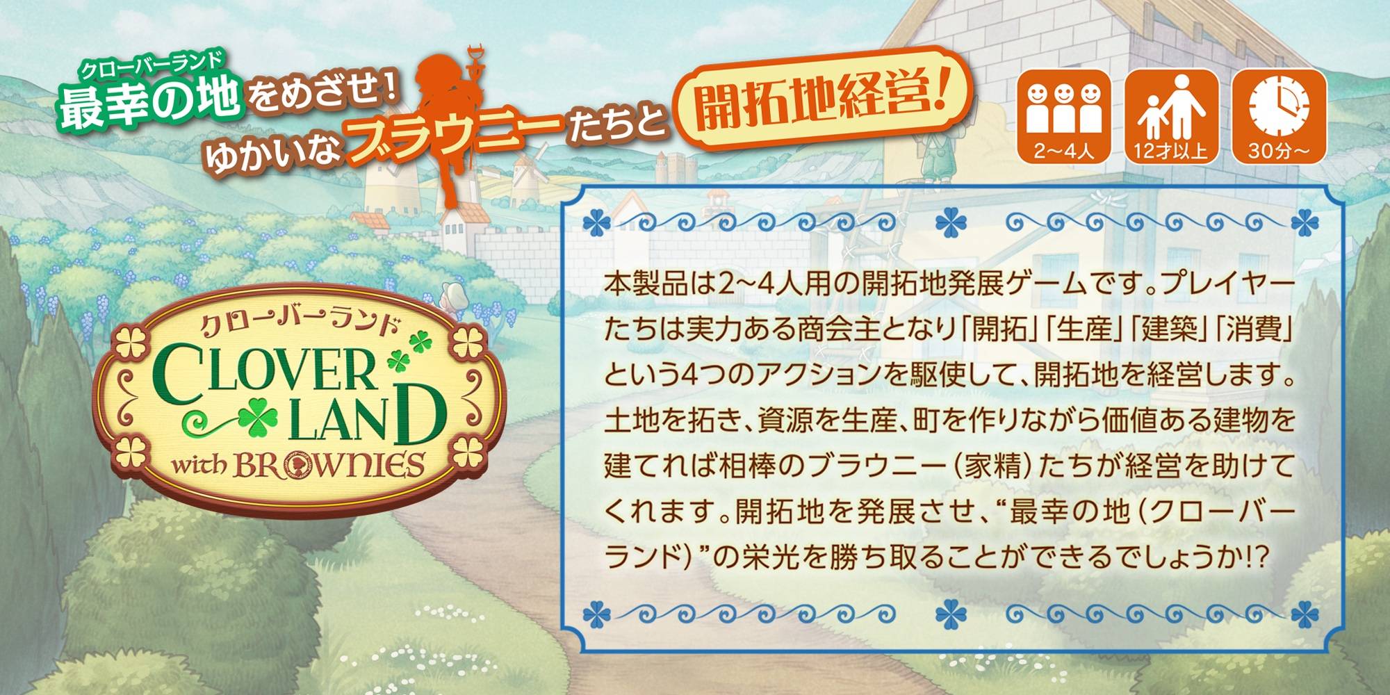 本製品は2~4人用の開拓地発展ゲームです。舞台は大開拓時代を迎えた西の島。プレイヤーたちは島の開拓を担う商人の町の商会主となり「開拓」「生産」「建築」「消費」という4つのアクションを駆使して、開拓地を経営します。土地を拓き、資源を生産、町を作りながら価値ある建物を建てれば相棒のブラウニー(家精)たちが経営を助けてくれます。開拓地を発展させ、“最幸の地(クローバーランド)”の栄光を勝ち取ることができるでしょうか!?