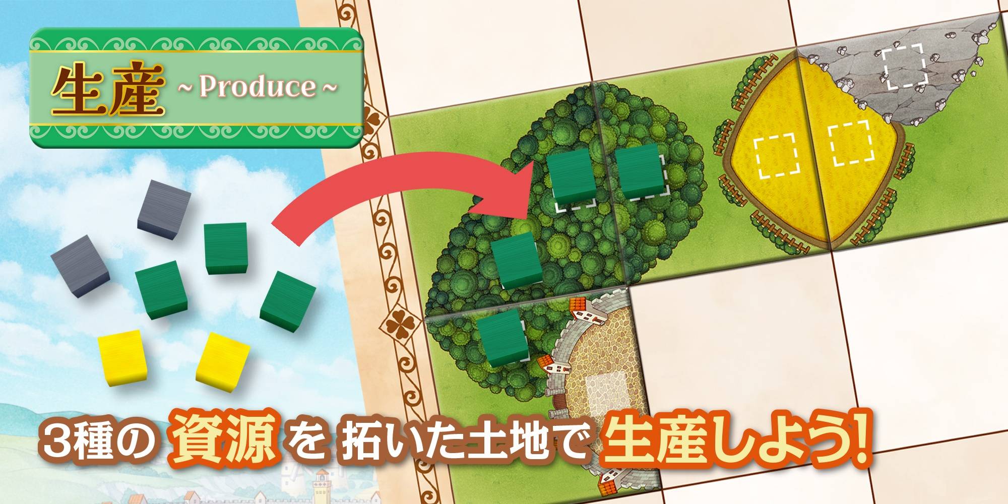 「生産」で完成したエリアに、そのエリアに応じたいずれかの資源(木、石、麦)を生み出すことができます。