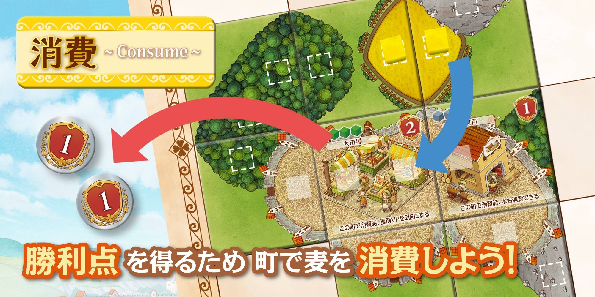「消費」で完成した町に麦を移して消費することができれば、その分の勝利点(VP)を獲得できます。