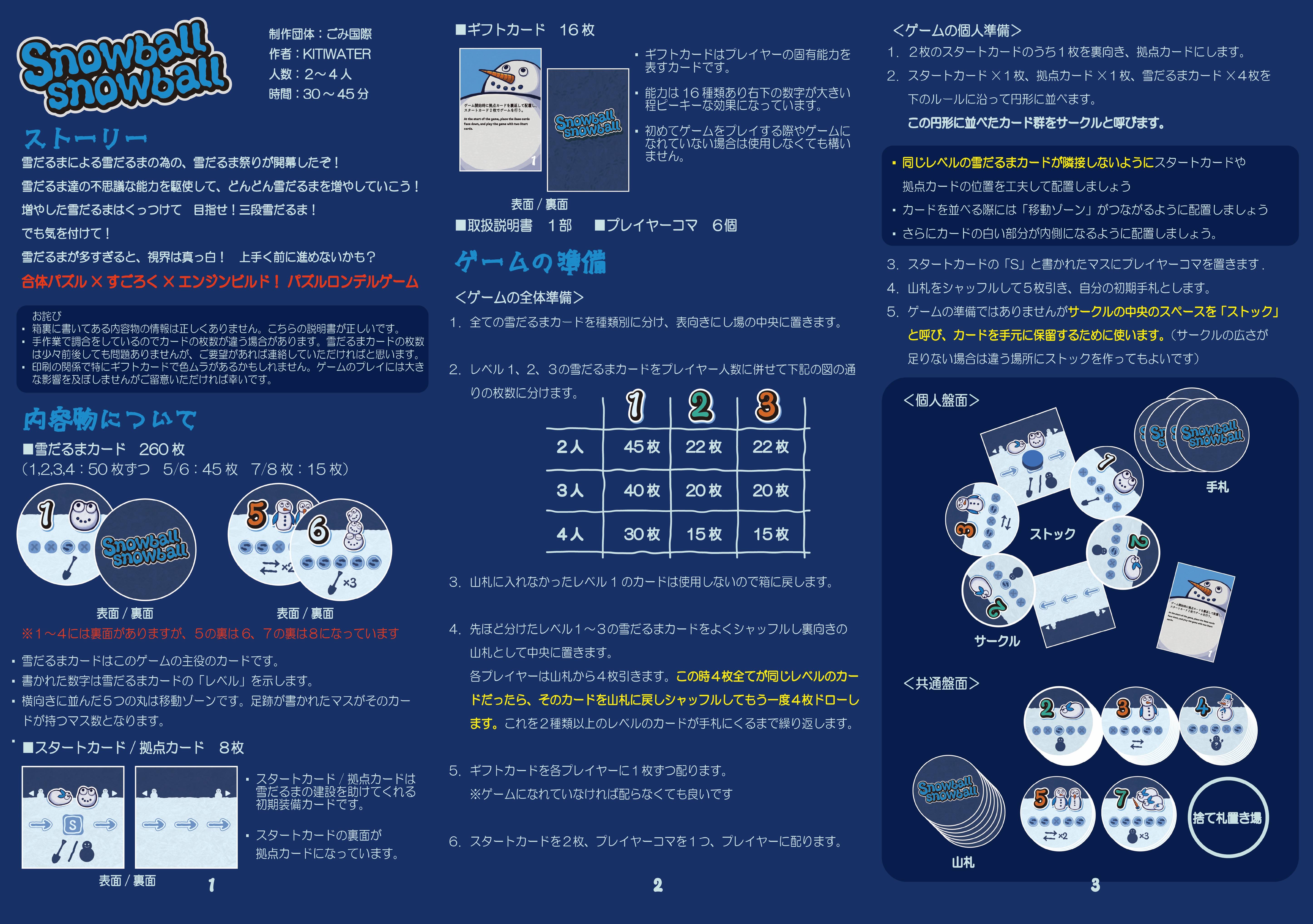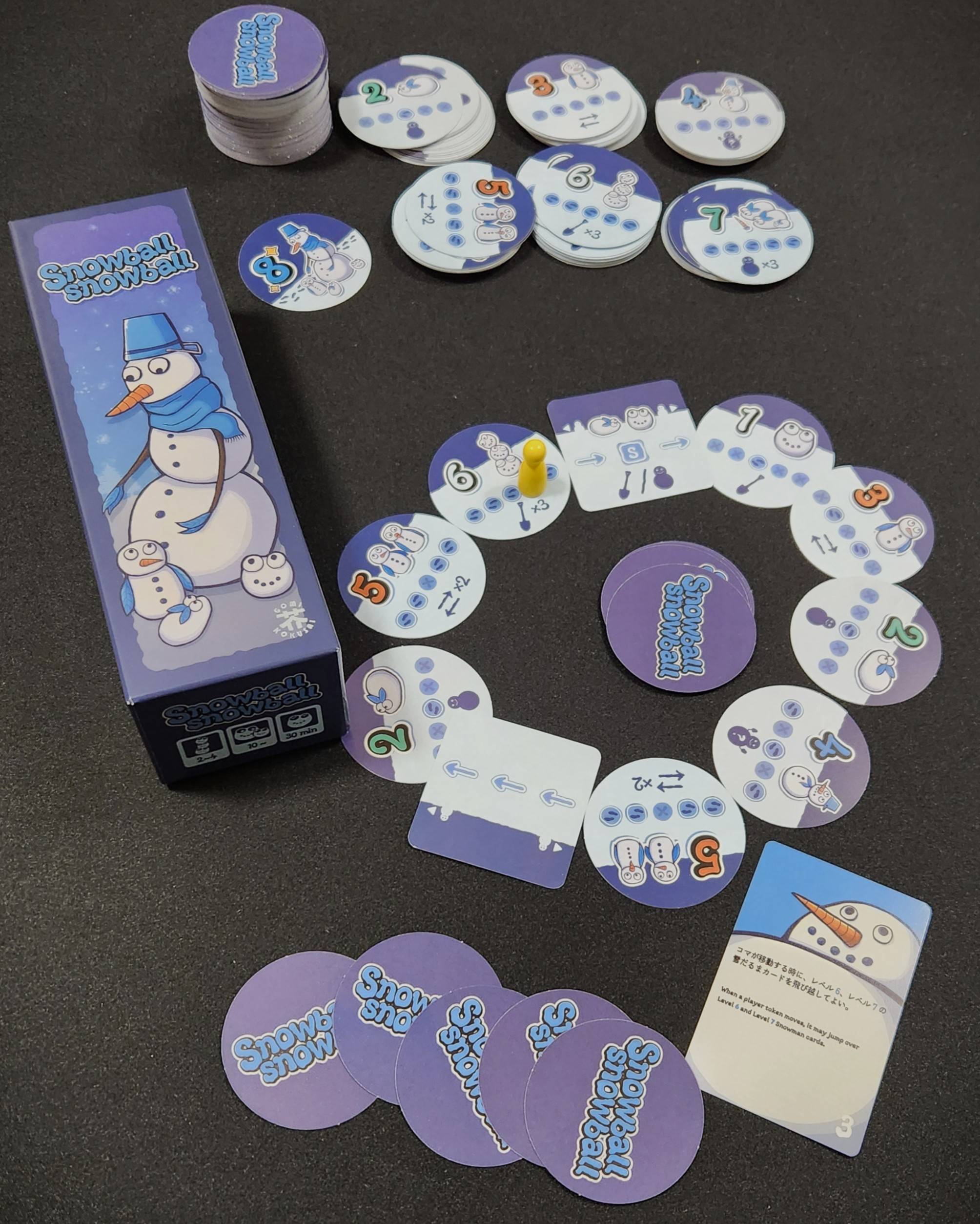 Snowball snowballは雪ダルマをどんどん建設し合体させる中量級パズルロンデルゲームです。建設した雪ダルマは円形のスゴロク(サークル)を作り、各プレイヤーはそれぞれのサークルを周回、雪ダルマを強化していき、レベル8の雪ダルマを建設したプレイヤーが勝者となります。