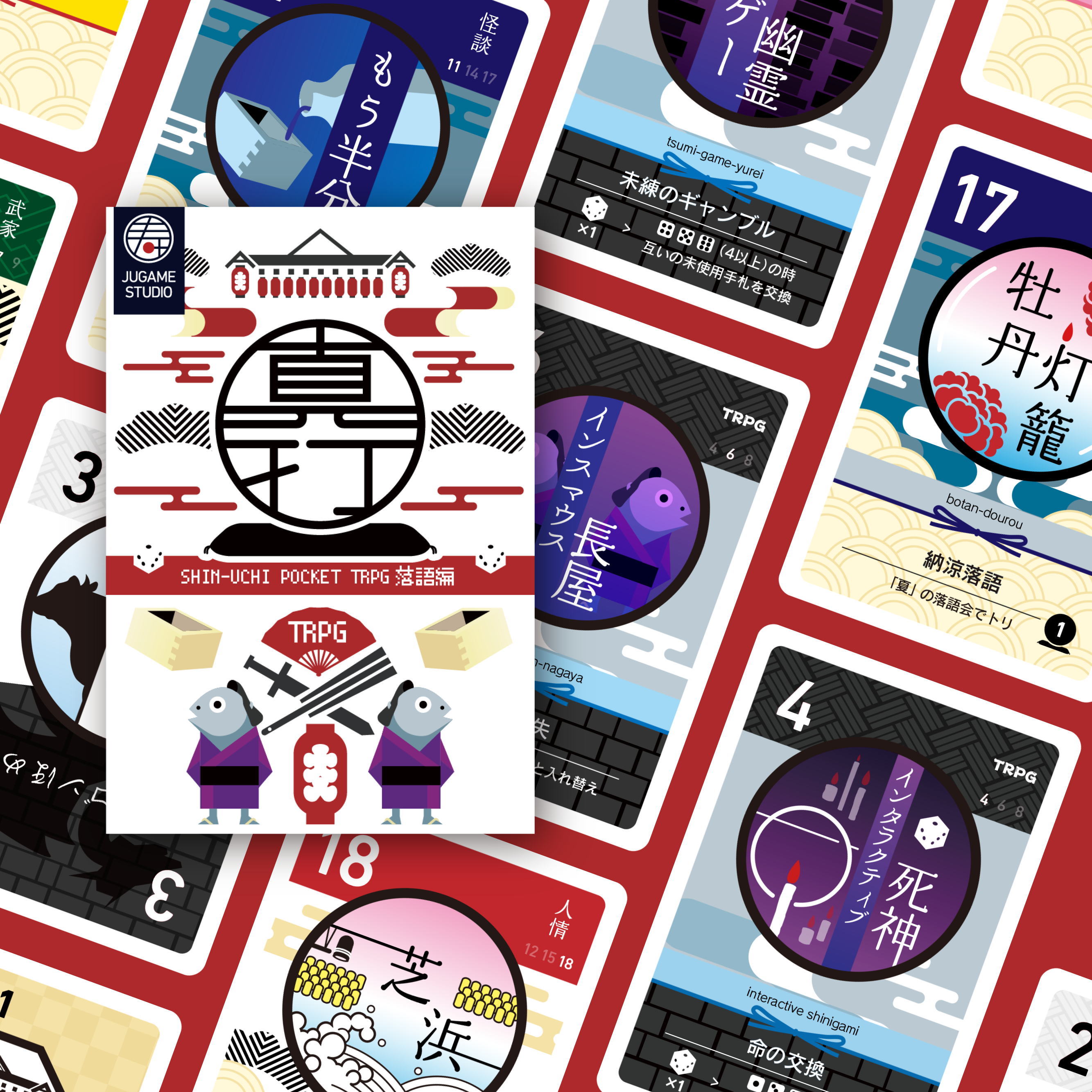 「真打POCKET TRPG落語編」はTRPGをテーマとした創作落語「TRPG落語」をカードとして追加した特別バージョンです。TRPG落語の創案者である三遊亭小圓楽師匠監修。TRPG落語の演目からインスピレーションを得た特殊効果も加わり従来の真打POCKETとはまた一味違う、ダイスによる一喜一憂なども味わえるバージョンとなっております。