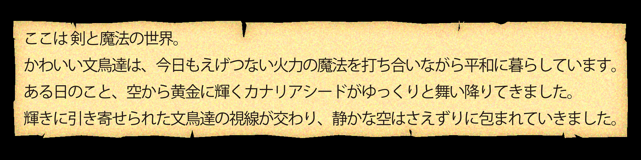 - 可愛らしい文鳥たちが、えげつない火力の魔法を打ち合う平和な世界(?)を舞台としたゲーム