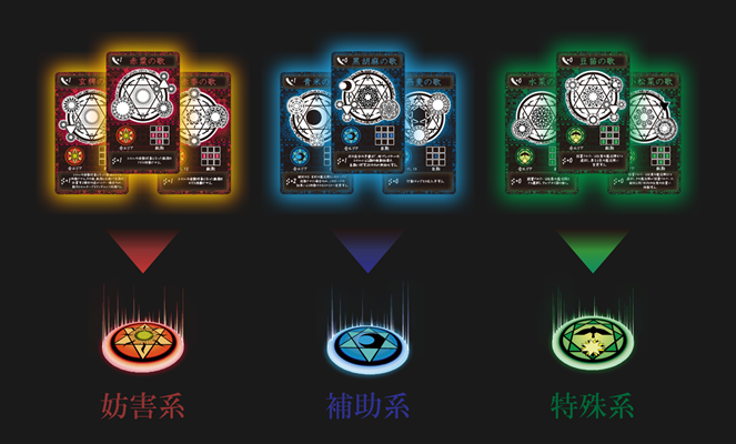 - 縦長ボードに妨害・補助・特殊の3種類の魔法陣を設置し、魔法のお歌(様々な効果カード)で魔法陣を起動して戦う
