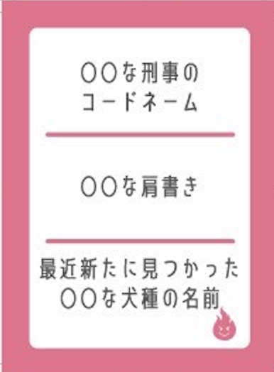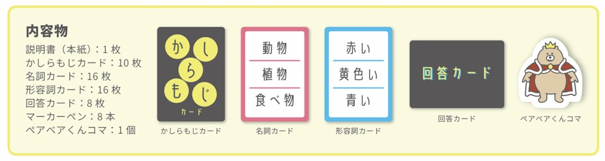 参加者に焦点をあてた名詞カード5枚+ペア難易度の高い大喜利チックな名詞カード5枚を追加して遊べるようになります。