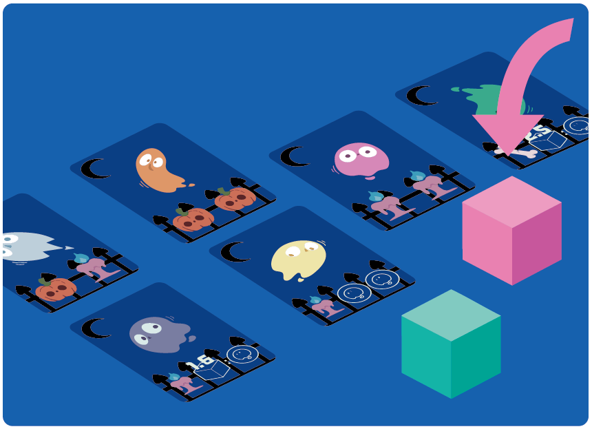 最終的にはカードのアイコンを掛け合わせて得点を競う、運と戦略が絡み合うスリリングなゲームです。